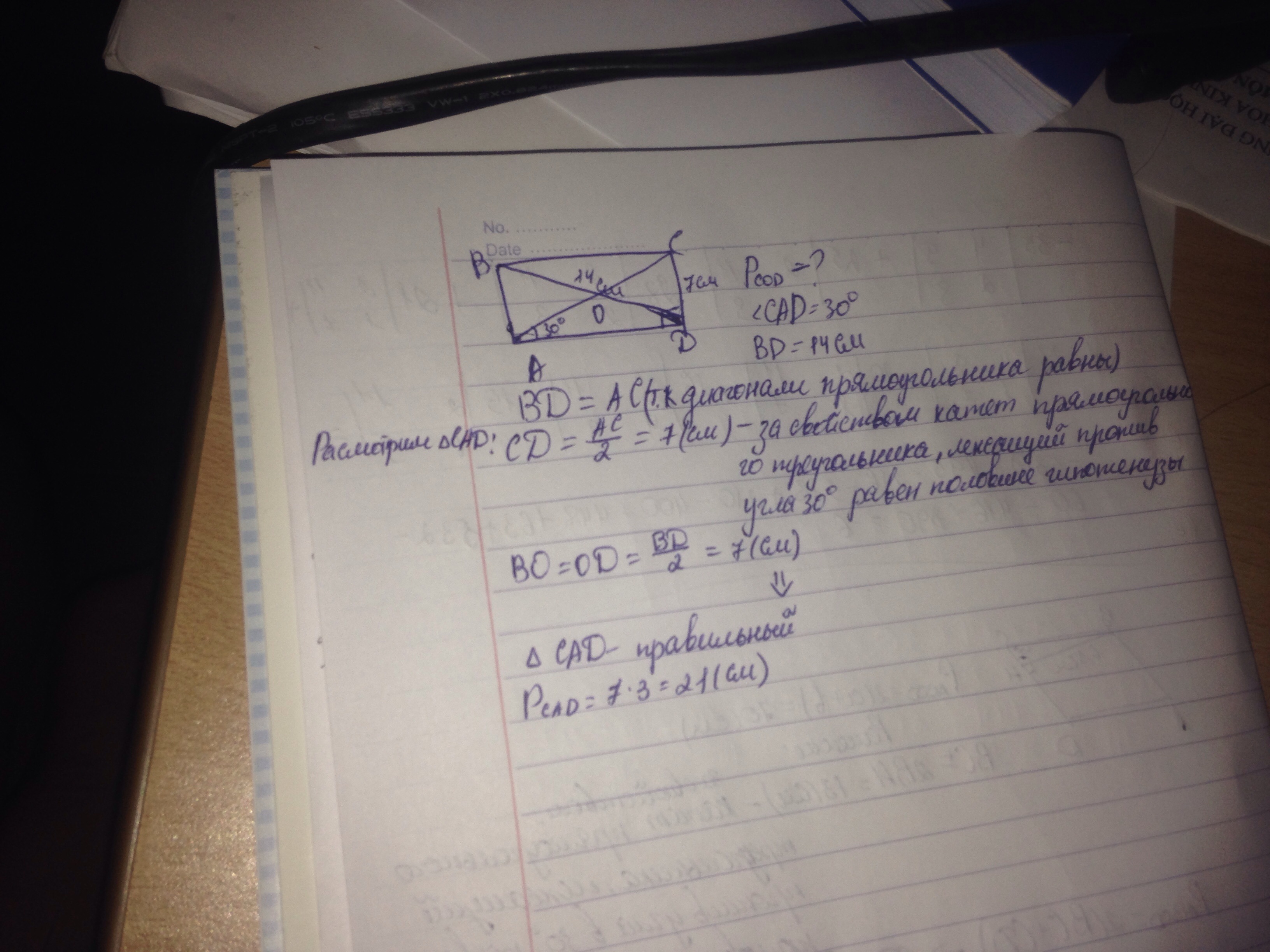 В прямоугольнике ABCD диагонали пересекаются в точке О. Найдите периметр треугольника СОD, если ˂СAD=30°, BD=14 см.