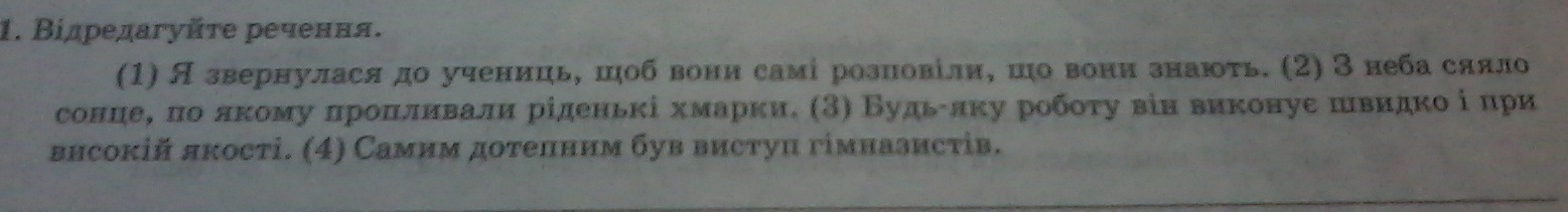 1. Я звернулася до учениць для того ,щоб вони розповіли мені все що знають .2. По небу пропливали ріденькі хмарки і сяяло сонце .3.Він виконує будь-яку роботу якісно і швидко .4.Найдотепнішим був виступ гімназистів