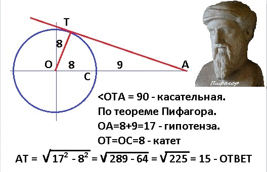 10. Прямая касается окружности в точке Т. Отрезок АО, где точка О – центр окружности, пересекает окружность в точке С. АС = 9, ОС = 8, ТА -?