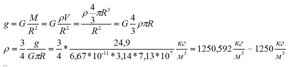 Ускорение свободного падения на поверхности Юпитера 24.9 м/c², а радиус планеты 7,13 *10^7 м. Вычислите по эти данным среднюю плотность планеты.