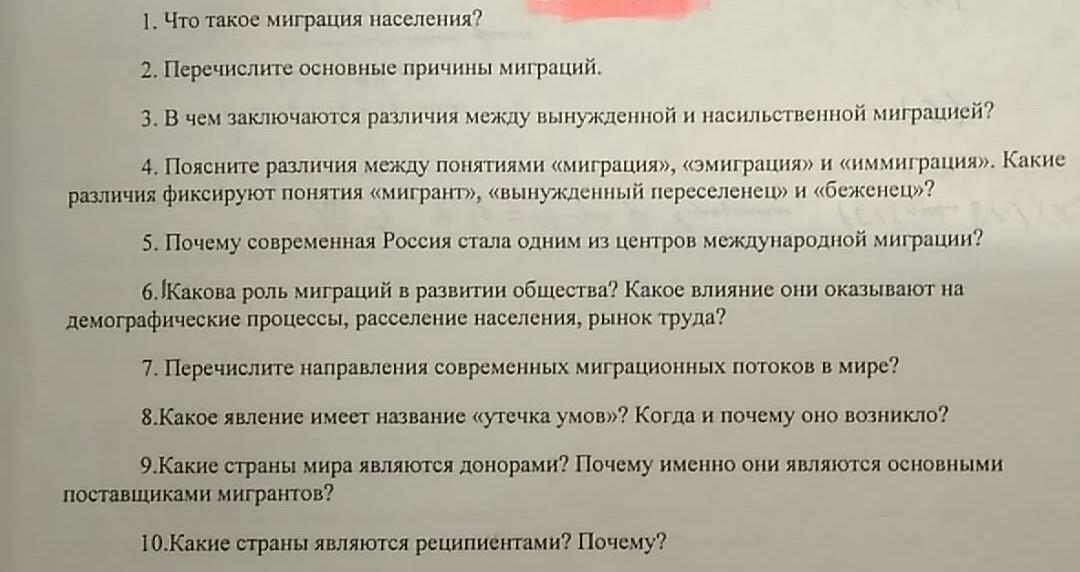 1. Миграция- это вынужденное или добровольное перемещение людей из одного региона/страны в другой на временное или постоянное прибывание.