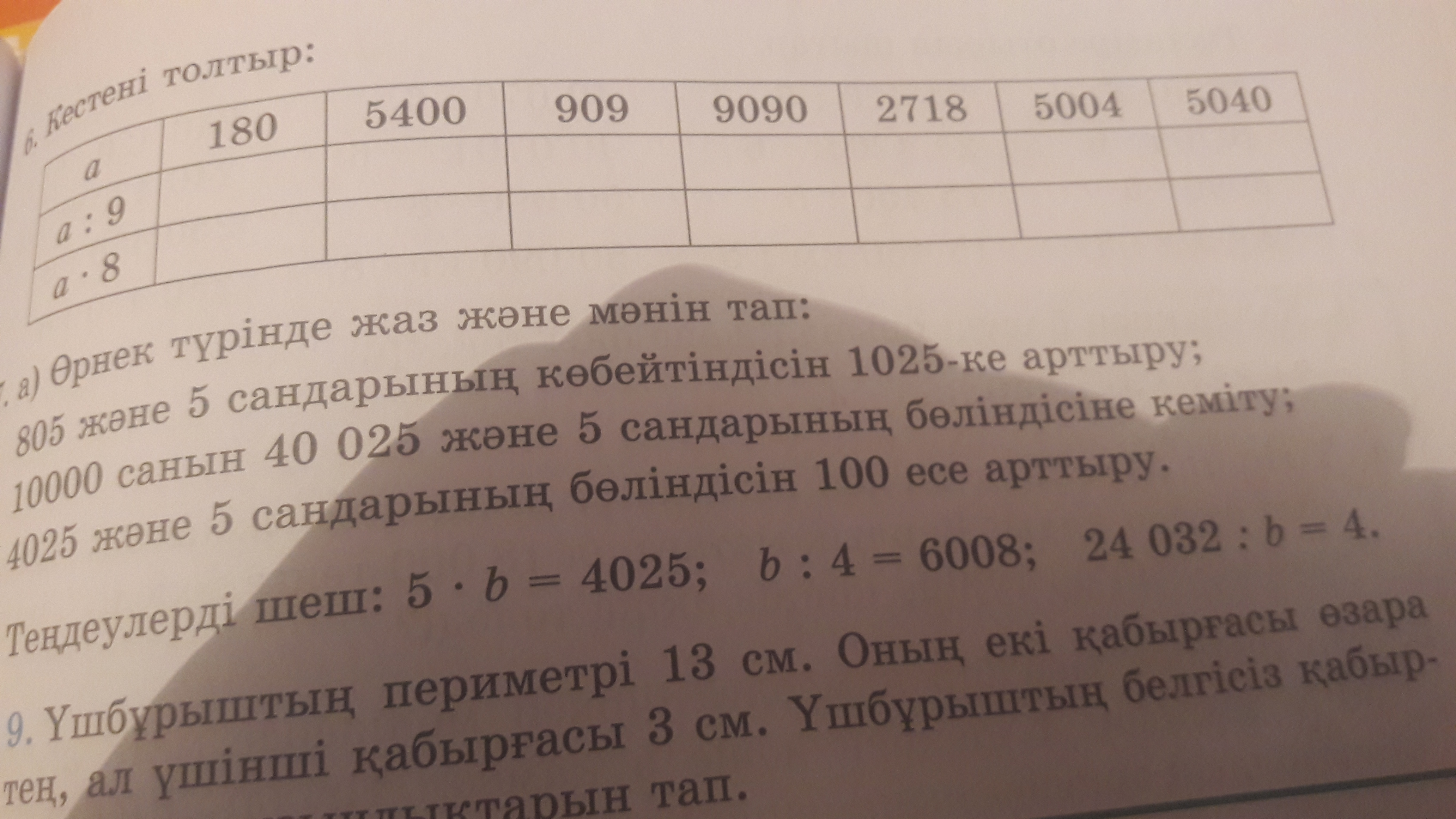 7 есеп 81 бет 4 сынып Өрнек түрінде жаз жəне мəнін тап: 805 жəне 5 сандарының көбейтіндісін 1025-ке арттыру; 10000 санын 40 025 жəне 5 сандарының бөліндісіне кеміту; 4025 жəне 5 сандарының бөліндісін 100 есе арттыру.