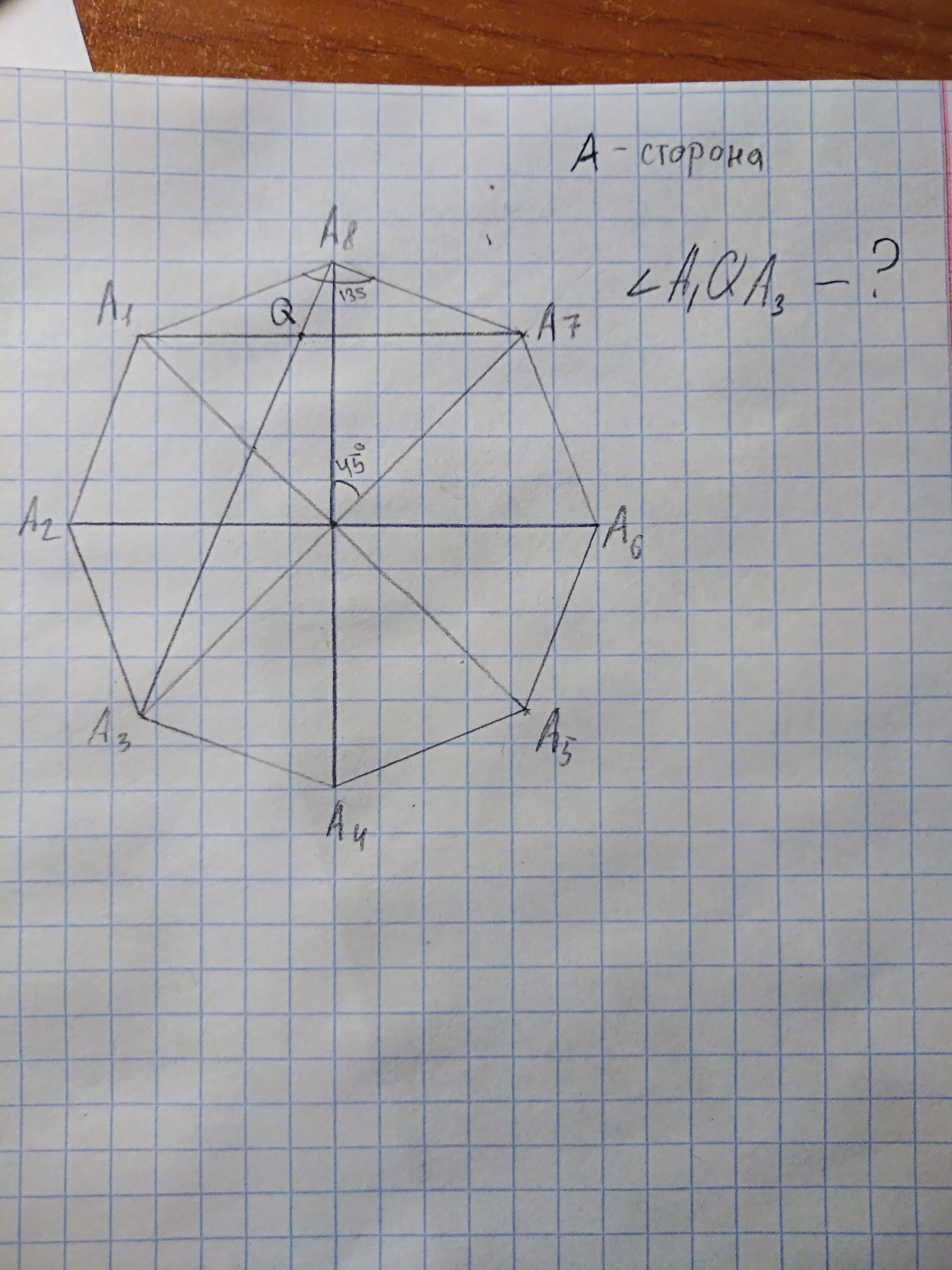 Значит <A1A2O=(180-45)/2=135/2=67.5=<A1QA3