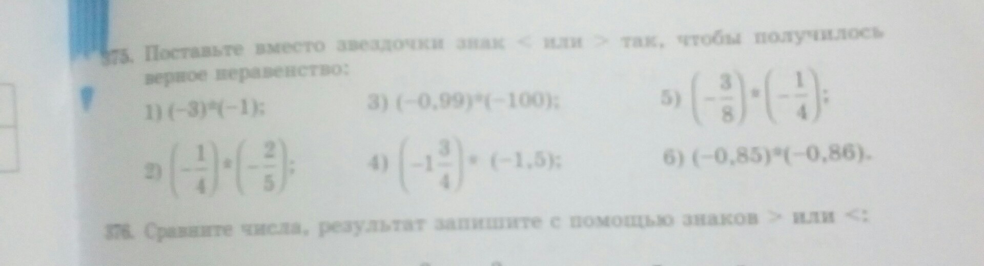 поставьте вместо звездочки знак больше меньше равно чтобы получилась верное неравенство(-3)*(-1) (-0,99)*(-100) (-1/4)*(- 2/5) (-1 3/4)*(-1,5) (-3/8)*(-1/4) (-0,85)*(-0,86
