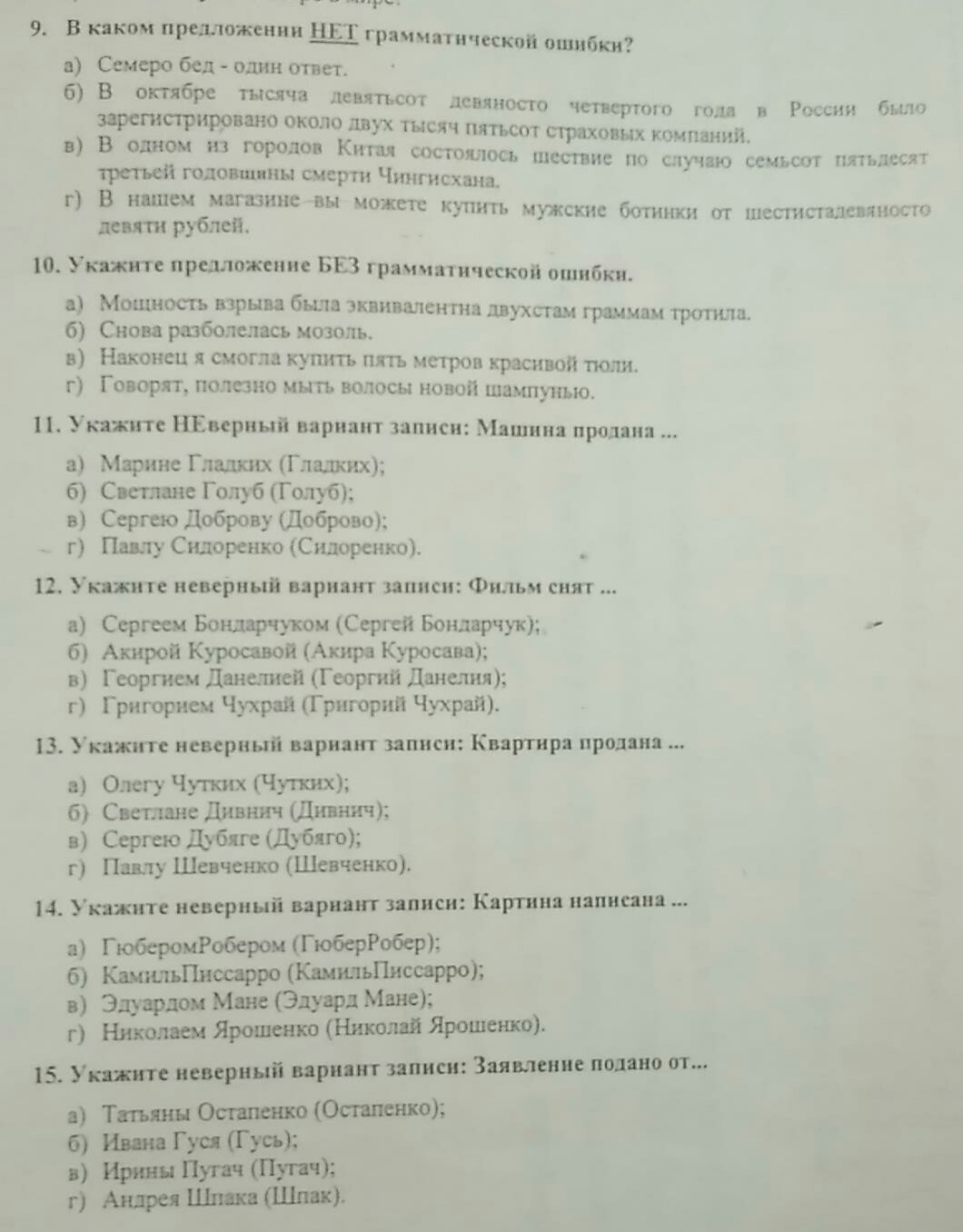 9-б (в остальных неправильно склоняли числительные) 10-б (в остальных неправильный под существительных) 11-в (не склоняется фамилия) 12- г (склоняется фамилия) 13- в (не склоняется) 14-б (имя склоняется) 15- все верные (мужские склоняются, а женские-нет)