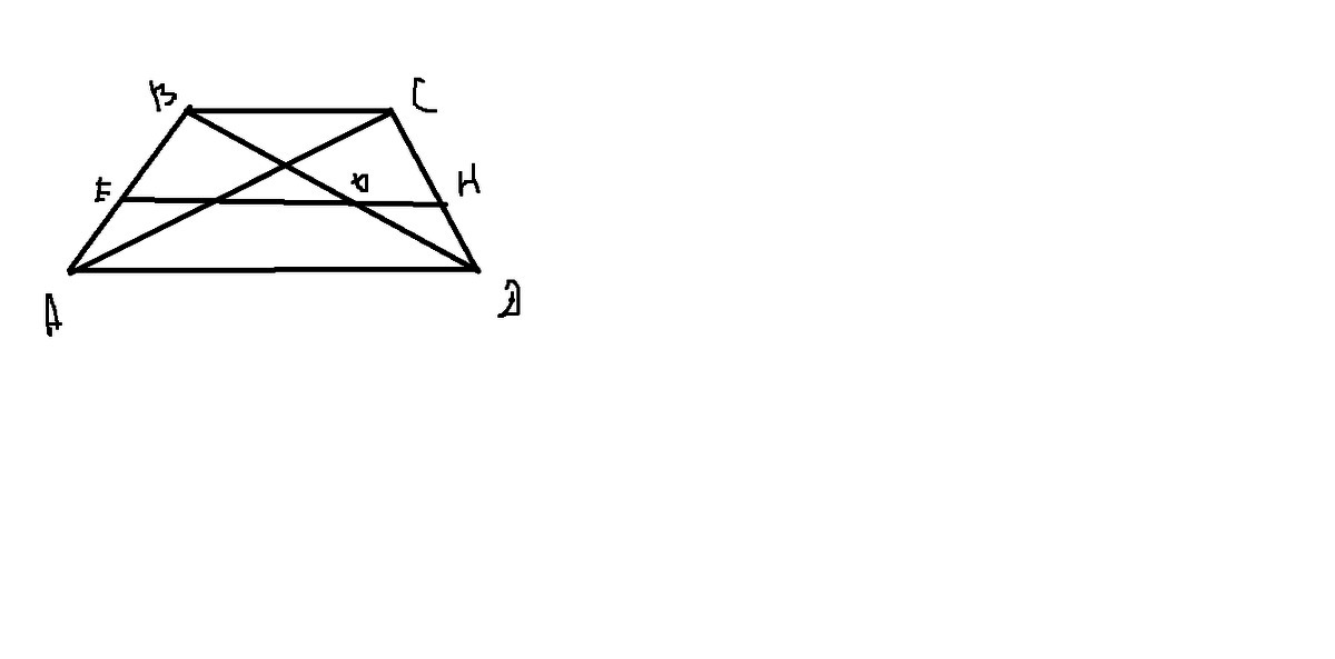 Средняя линия делит и диагонали пополам. Поэтому, если рассмотреть треугольники ВСД, в нем НО - средняя линия, значит ВС в 2 раза больше будет. Пусть ОН = х, тогда ВС = 2х. Рассмотрим треугольник АВД, здесь средняя линия ЕО=2х, тогда АД=4х. Отношение: 2х/4х=1/2