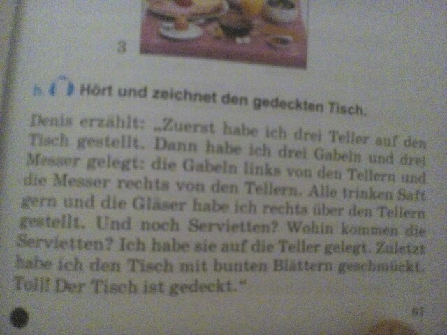 Дэнис рассказывает: "Сначала я поставил на стол три тарелки. Потом я положил три вилки и три ножа: вилки слева от тарелок, а ножи справа. Все любят пить сок и я поставил стаканы справа вверху от тарелок. А еще салфетки? Куда положить салфетки? Я положил их на тарелки. В самом конце я украсил стол цветными листьями. Класс! Теперь стол накрыт."