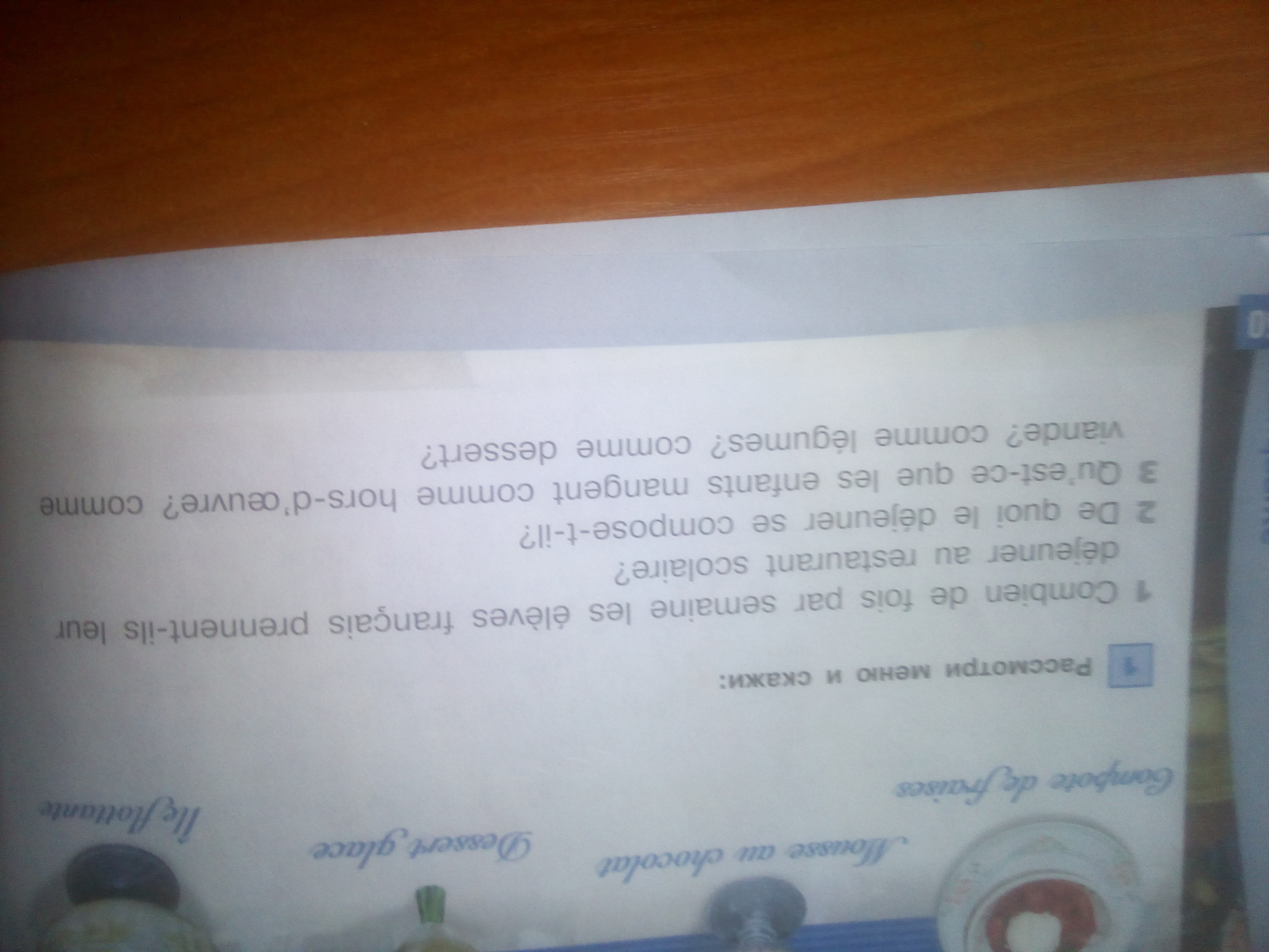 ex 3. le lundi les eleves francais mangent de la salade de concombre ( comme hors- d'oeure), du roti de boeuf( comme viande), des haricots verts (comme legumes), de la creme au chocolat (comme dessert). le mardi ils mangent de la salade de tomates (comme hors-d'oevre), du roti de porc (comme viande), de la puree de pomme de terre(comme legumes), de lacompote de fraises (comme dessert). le jeudi ils mangent de la salade verte (comme hors-d'oeuvre),du poulet roti (comme viande), des petits pois (comme legumes), de la glace( comme dessert). le vendredi ils mangent des carottes rapees(comme hors-d'oeuvre), du poisson frit (comme poisson), des pomme de terre frites (comme legumes), de la salade de fruits (comme dessert).