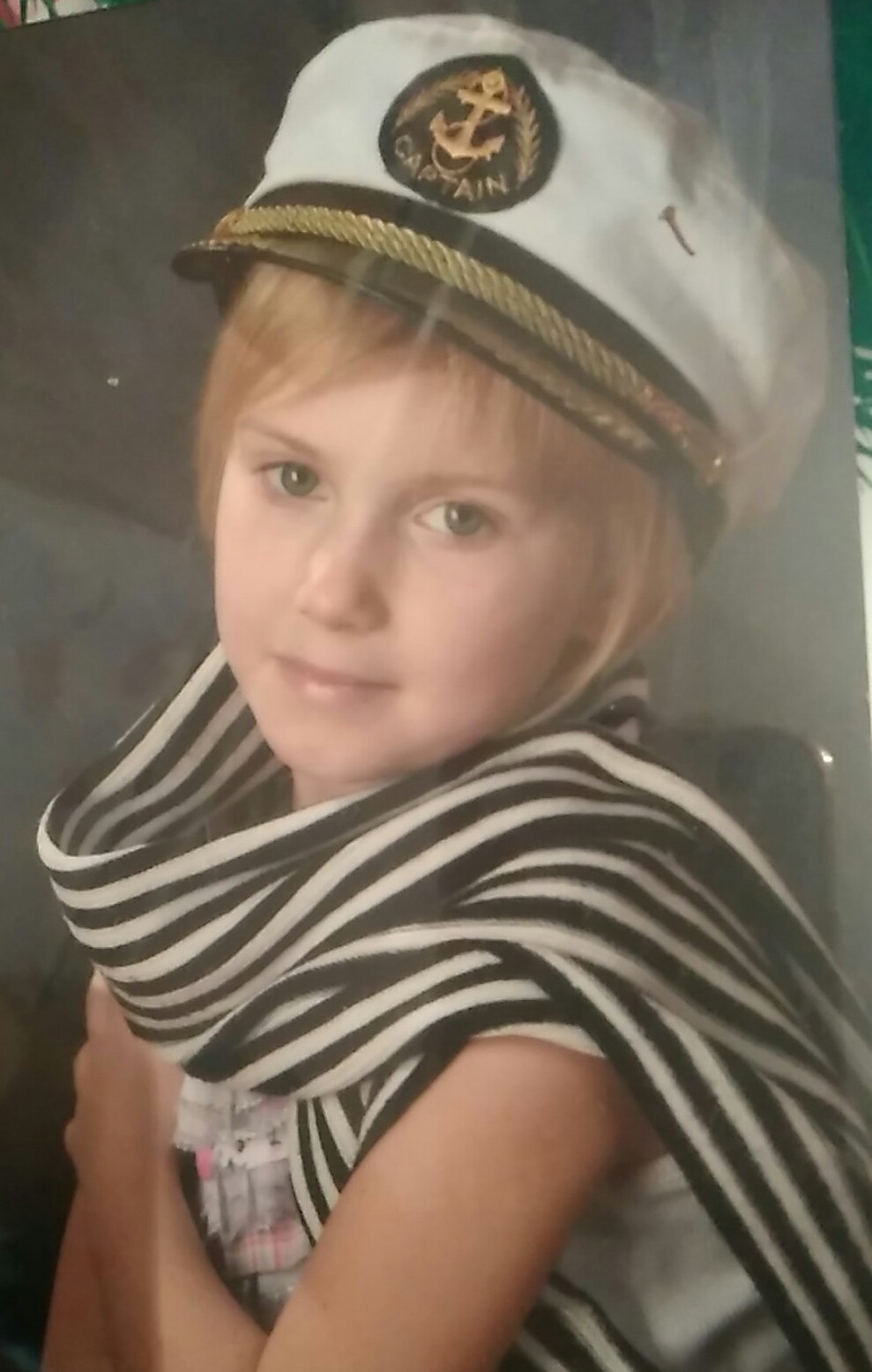 у этой девочки очень красивые зелёные глаза и светлые волосы, сегодня она о дела красивое платье! А как ей идет этот шарф и кнопка капитана