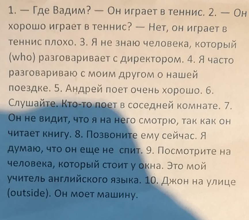 1. Where's Vadim? He playing tennis. 2. Is he good in playing tennis? No, he don't good in playing tennis. 3. I don't know person, who talking, with director. 4. I often talk with my friend about our travel. 5. Andrew very good in singing. 6. Listen. Somebody is singing in room, near we. 7.