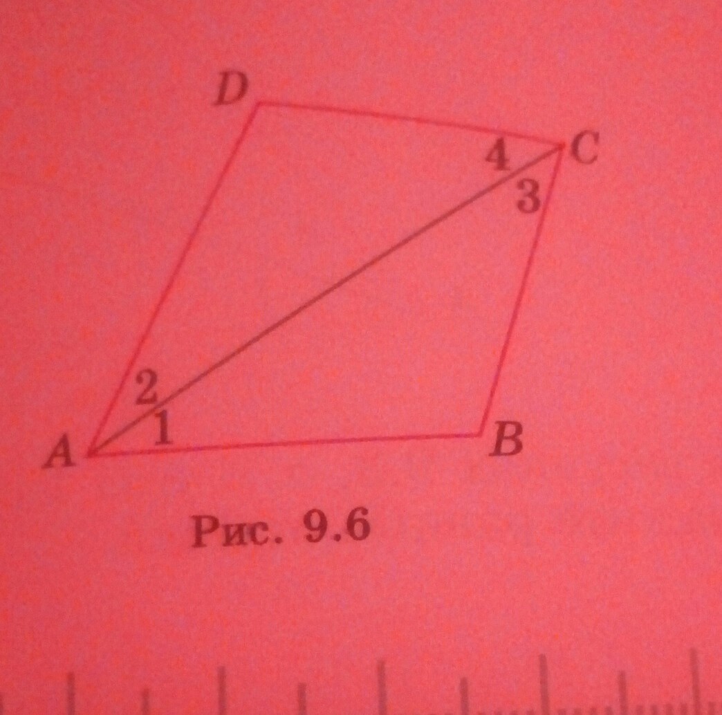 на рисунке 9.6 угол 1 равен углу 2, угол 3 равен углу 4. докажите что AB=AD