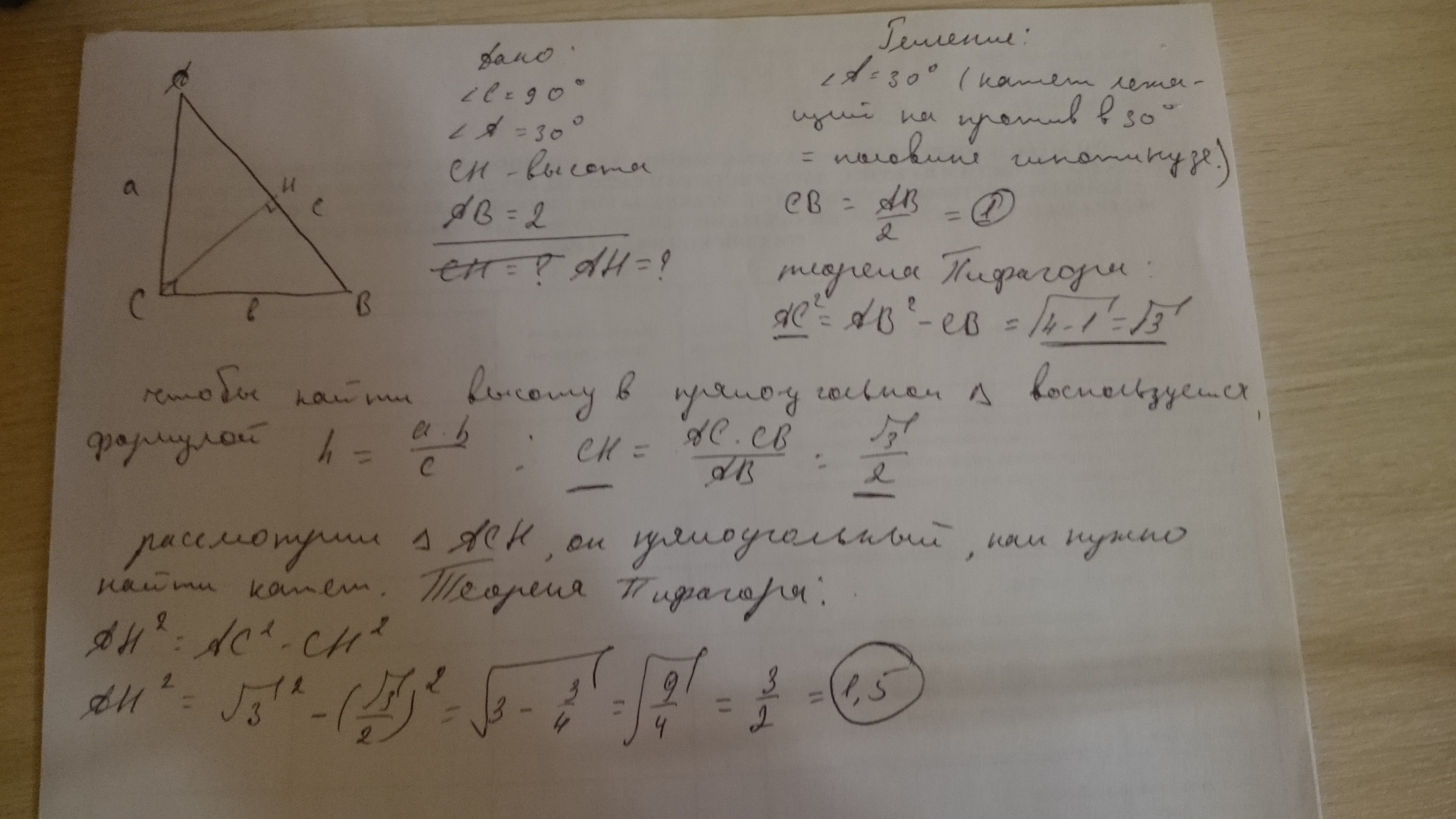 В треугольнике ABC угол C равен 90, CH - высота, угол A равен 30, AB=2. Найдите AH