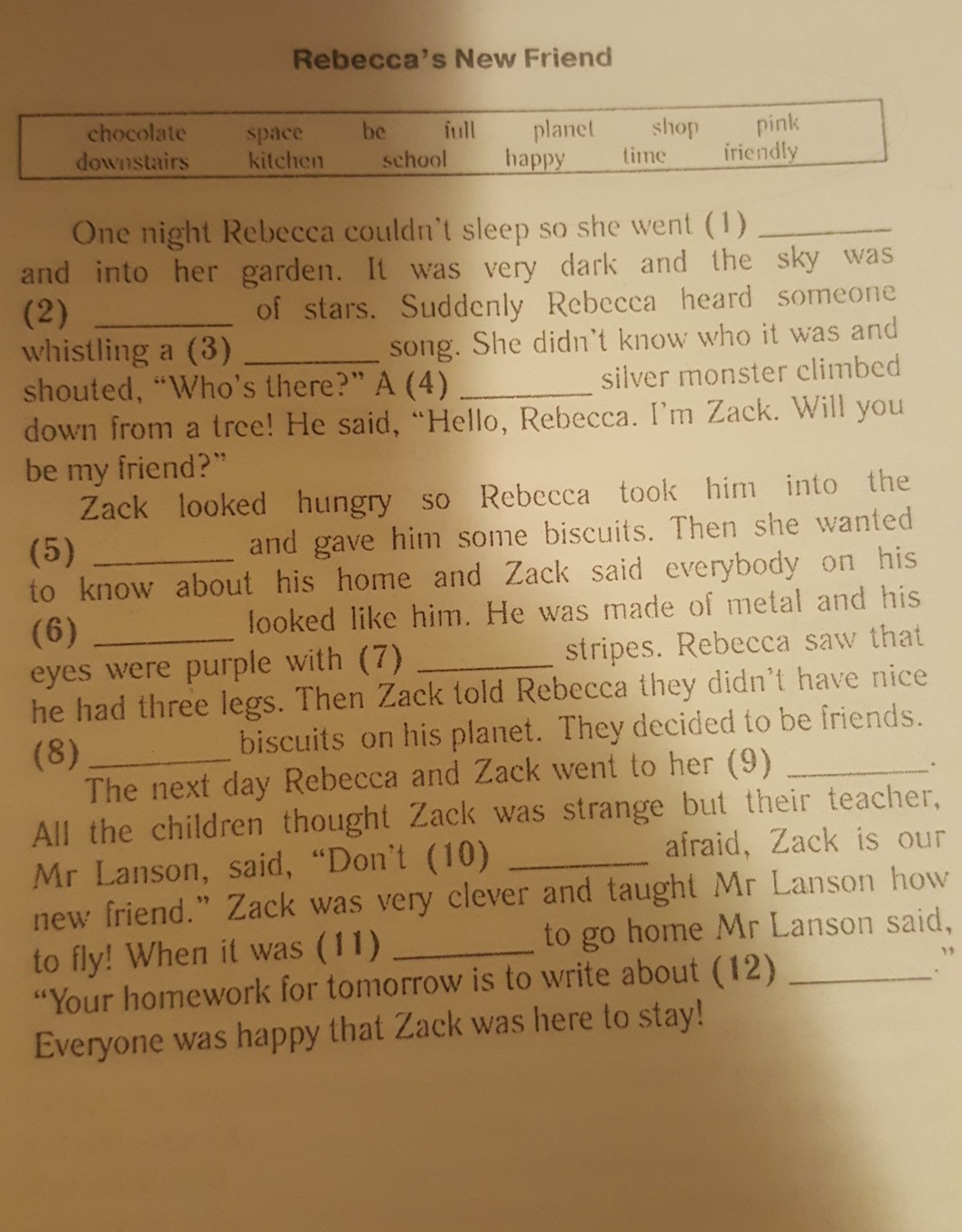 1 downstairs 2 full 3 happy 4 friendly 5 kitchen 6 planet 7 pink 8 chocolate 9 school 10 be 11 time 12 space