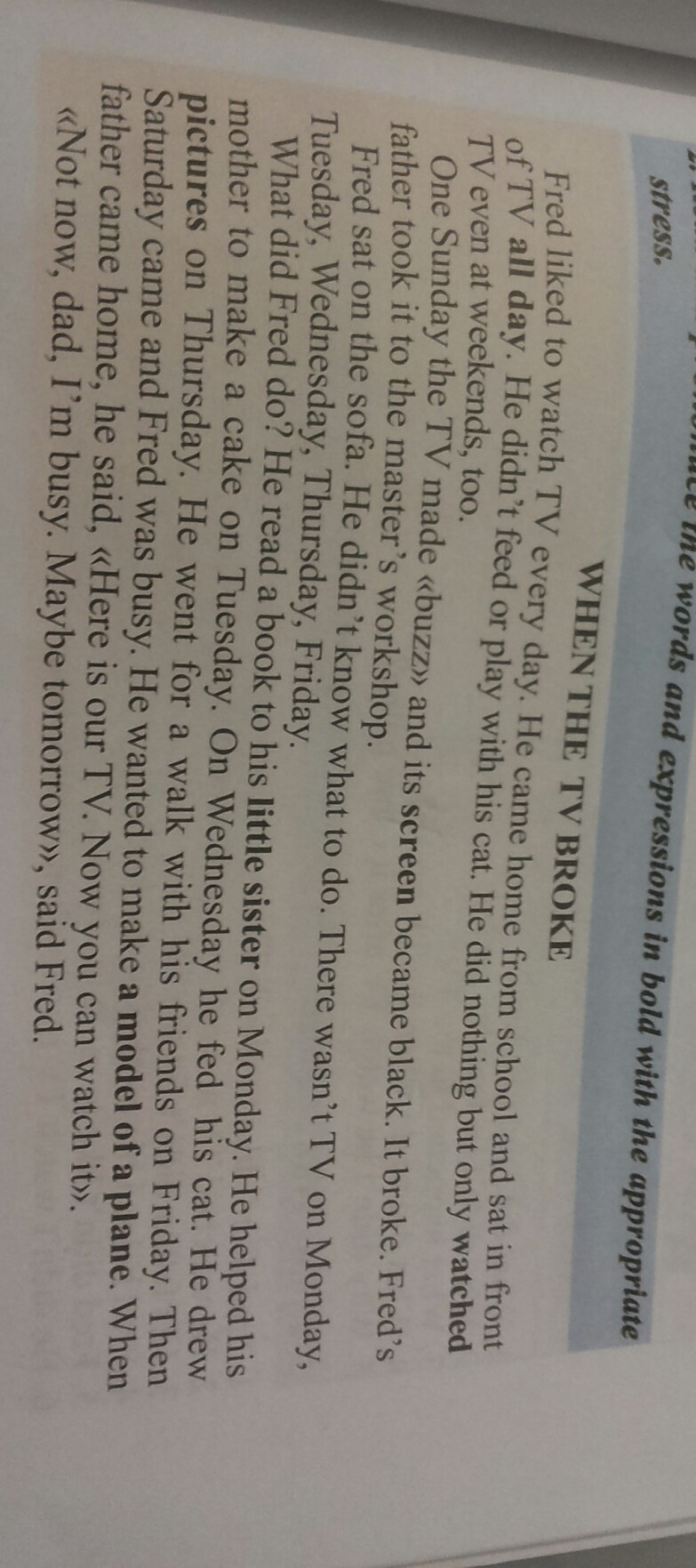 Что делал Фред? Он прочитал книгу маленькой сестре в понедельник. Он помог маме приготовит торт во вторник. В среду он покормил кошку. Он нарисовал картинки в четверг. Он пошел гулять с друзьями в пятницу. Потом настала суббота и Фред был занят. Он хотел сделать модель самолета. Когда отец пришел домой, он сказал "Вот наш ТВ.Теперь можешь смотреть его". - "Не сейчас, пап, я занят. Может быть, завтра" - сказал Фред.