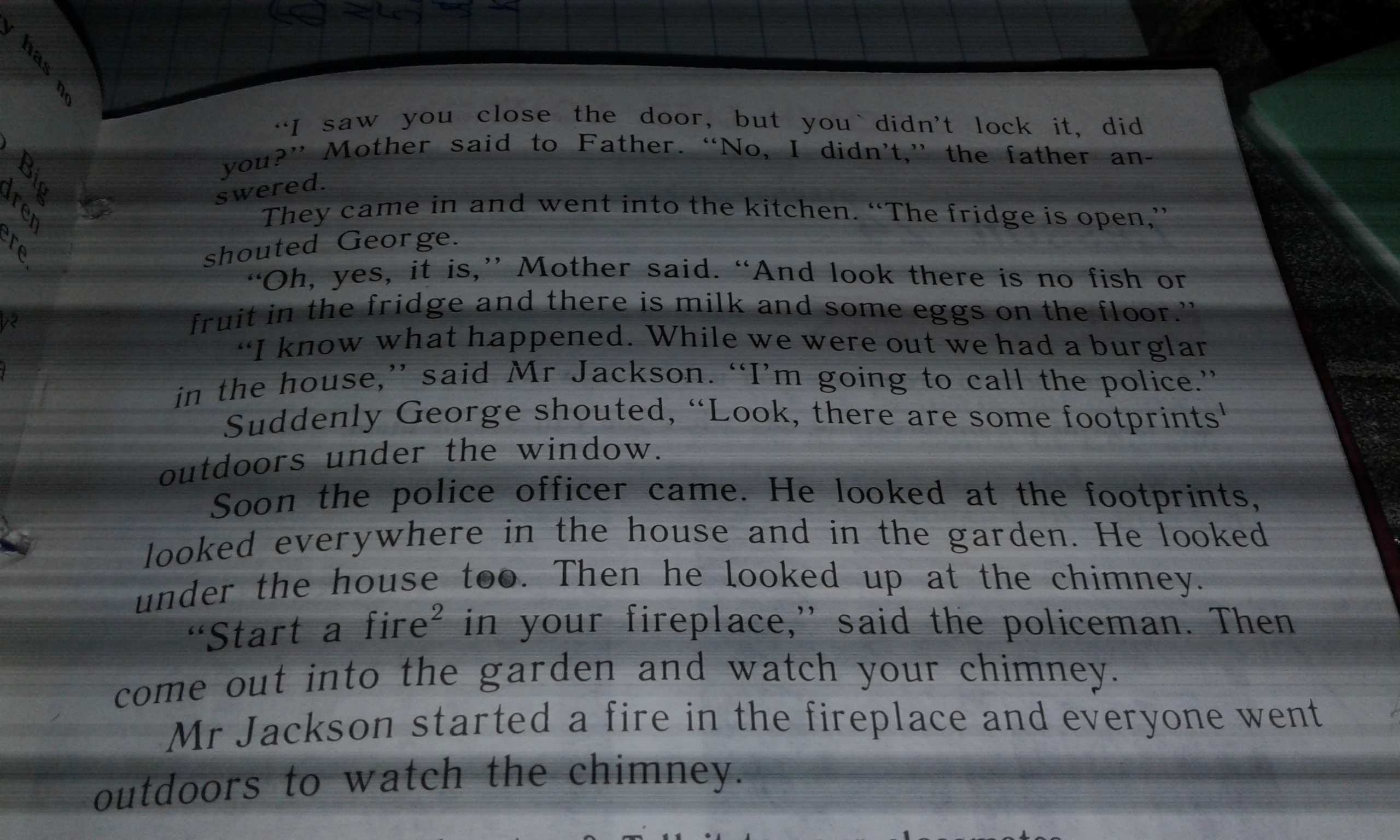 Я видел, как ты закрыл дверь. но ты не запирал его, сказал Артер, чтобы отец отступил и вышел на кухню. Скрытый отклик крикнул, что Джордж Мать сказала И посмотри, нет или нет, «да, он знает, что случилось. Пока мы были у нас, у нас был бургер - спросил Джексон, когда Джек позвонил в полицию. Джордж крикнул: «Послушайте, на окнах есть под открытым небом полицейский. Он посмотрел на следы. смотрел повсюду в доме и в саду. Он посмотрел на дом. Затем он посмотрел на дымоход. начните огонь в вашей лиге, сказал полицейский. Затем выходите в сад и смотрите на дымоход. Джексон начал огонь в лиге, и все пошли смотреть на дымоход на улицу 3AKPblTb