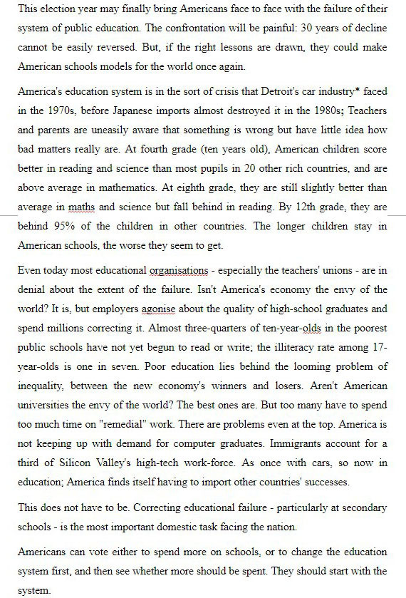 Этот год выборов, наконец, может привести американцев лицом к лицу с провалом их системы государственного образования. Противостояние будет болезненным: 30 лет упадка не может быть легко обращена вспять. Но, если будут проведены правильные уроки, они снова смогут сделать американские школы образцами для всего мира. Американская система образования находится в своего рода кризис, который автомобильная промышленность Детройта* столкнулась в 1970-х годах, прежде чем японский импорт почти уничтожил его в 1980-х; учителя и родители плохо понимают, что что-то не так, но понятия не имеют, насколько плохие вопросы на самом деле. В четвертом классе (десять лет), американские дети забивают лучше в чтении и науке, чем большинство учеников в 20 других богатых странах, и выше среднего по математике. В восьмом классе, они по-прежнему немного лучше, чем в среднем по математике и науке, но отстают в чтении. К 12-му классу они отстают от 95% детей в других странах. Чем дольше дети остаются в американских школах, тем хуже им кажется. Даже сегодня большинство образовательных организаций, особенно профсоюзов учителей - идут в отказ о степени сбоя. Разве экономика Америки не зависть всему миру? Это так, но работодатели агонизируют качество выпускников средних школ и тратят миллионы на его исправление. Почти три четверти десятилетних детей в беднейших государственных школах еще не начали читать и писать; уровень неграмотности среди 17-летних составляет один из семи. Плохое образование стоит за надвигающейся проблемой неравенства между победителями и проигравшими в новой экономике. Разве американские университеты не зависть всему миру? Лучшие из них. Но слишком многим приходится тратить слишком много времени на "оздоровительную" работу. Проблемы есть даже наверху. Америка не идет в ногу со спросом на компьютерных выпускников. На долю иммигрантов приходится треть высокотехнологичной рабочей силы Силиконовой долины. Как когда-то с автомобилями, так и сейчас в сфере образования; Америка оказывается вынуждена импортировать успехи других стран. Такого не должно быть. Коррекция успеваемости, особенно в средних школах - является наиболее важным внутренним задач, стоящих перед страной. Американцы могут проголосовать либо за то, чтобы больше тратить на школы, либо сначала изменить систему образования, а потом посмотреть, стоит ли больше тратить. Они должны начать с системы.