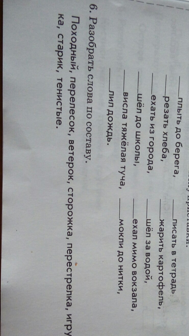 5.Доплыть до берега,разрезать хлеба,заехать из города,дошёл до школы,нависла тяжелая туча, полил дождь,записать в тетрадь,пожарить картофель,пошёл за водой, проехал мимо вокзала,промокли до нитки.