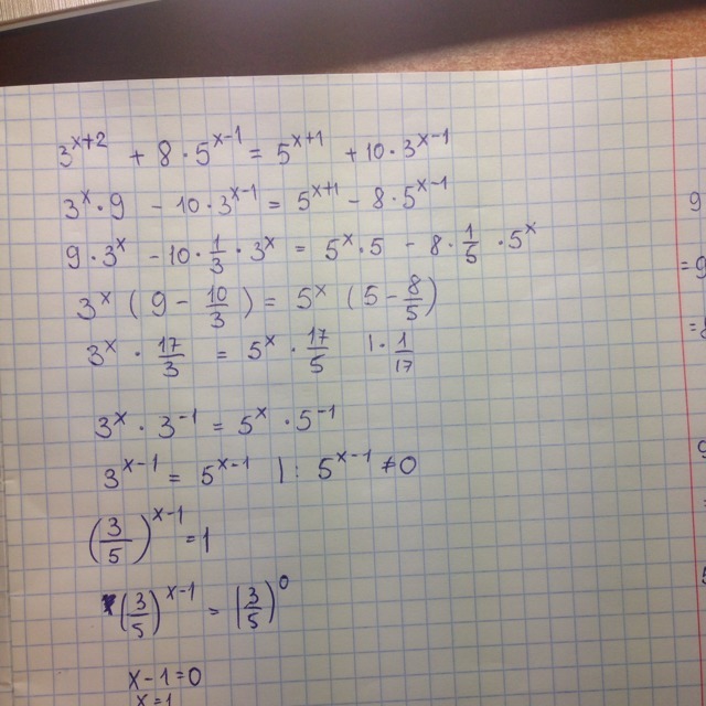Решить уравнение: 3ˣ⁺²+8*5ˣ⁻¹=5ˣ⁺¹+10*3ˣ⁻¹