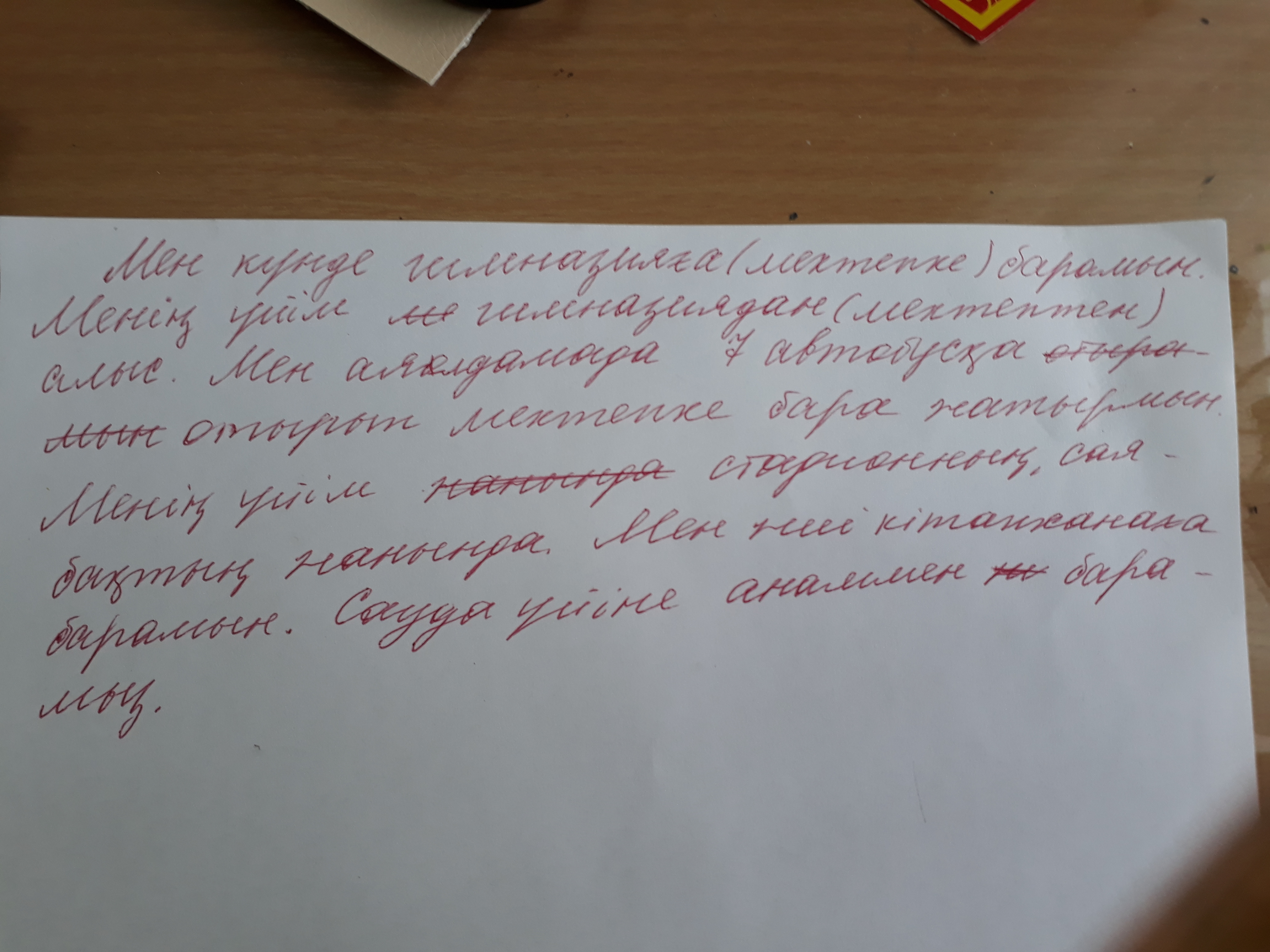 Менің үйім аялдаманың қасында орналасқан. Мен аялдамада автобусты күтіп, стадионға барамын. Өйткені менде бүгін жарыс болады. Мен жарыста жеңдім, сол үшін кафеге барамын. Сол жерде жеп болған соң өз мектебіме автобуспен барамын. Мектептен кейін саябаққа барып, сол жерде жинап, өсімдіктерді суарамын. Содан кейін үйге қайтамын.
