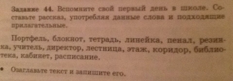 Поднявшись на наш этаж, я увидела мою учительницу и директора. Пройдя по длинному коридору, я дошла до класса. Учительница сказал нам расписание уроков и какие учебники надо принести. После уроков я пошла в библиотеку что бы взять книгу для внеклассного чтения.