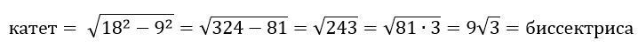 Если в равностороннем треугольнике, сторона которого равна 18м провести биссектрису или медиану, то получится два прямоугольных треугольника у которых гипотенуза равна 18 м и катет 18/2=9м, а второй катет(биссектриса) нужно будет найти по теореме Пифагора.