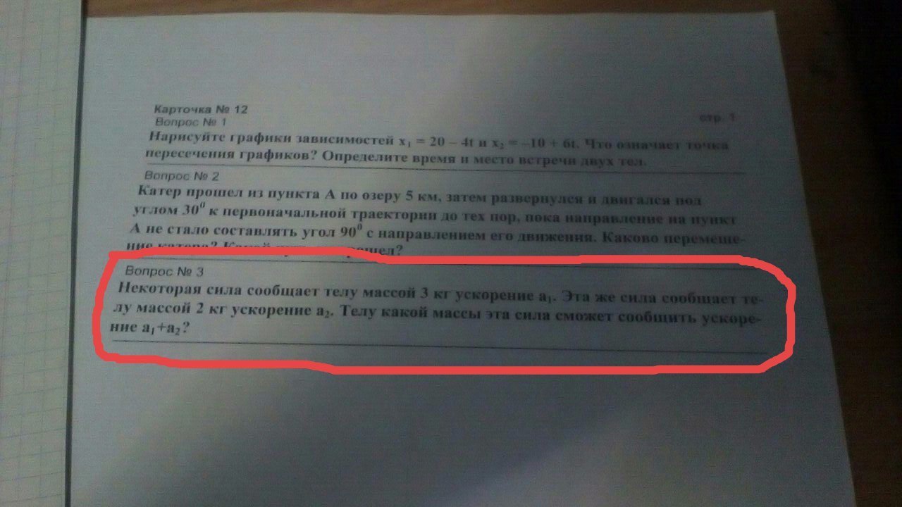 некоторая сила сообщает телу массой 3 кг ускорение a1. Эта же сила сообщает телу массой 2 кг ускорение a2. Телу какой массы эта сила сможет сообщить ускорение а1 + а2