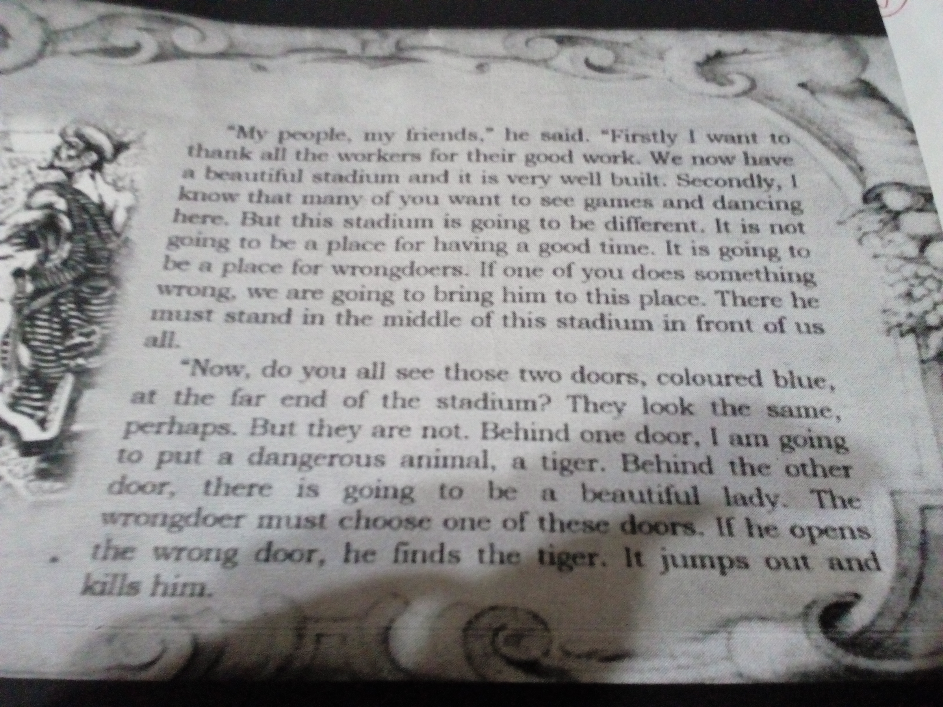 А сейчас, видите две синие двери в дальнем конце стадиона? Возможно, они выглядят абсолютно одинаковыми. Но это не так. За одну из дверей я собираюсь посадить опасное животное, тигра. За второй же будет прекрасная девушка. Нарушитель должен будет выбрать одну из этих дверей. Если откроет не ту дверь, то найдёт тигра. Тот выпрыгнет и убьёт его. Если же откроет другую дверь, то найдёт красивую молодую девушку. Она станет его женой. Они обязаны будут жениться немедленно, прямо здесь, в стадионе, на глазах у всех нас. После этого они смогут жить счастливо с нами в качестве мужа и жены. Так что каждый нарушитель должен будет выбирать крайне осторожно. Перед тем, как выбор будет сделан, он (и мы тоже) не будет знать, будет ли он жить или же умрёт. Как только он откроет одну из дверей, мы сразу же это узнаем. Это моя идея. Что же, скажите мне, друзья мои, хорошая ли это идея или нет?"