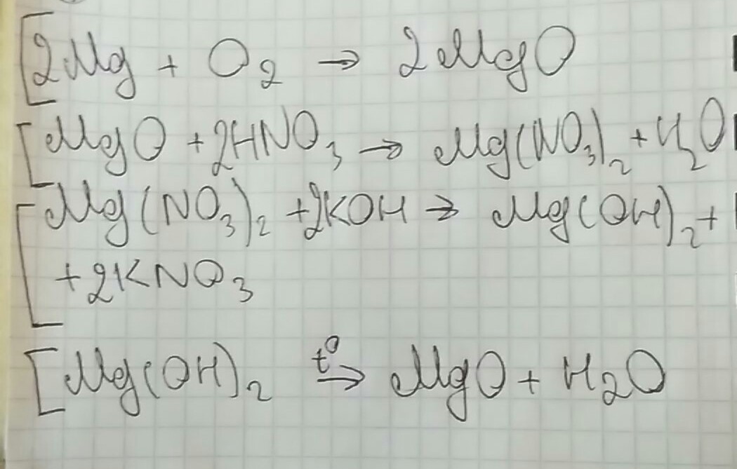 Напишите уравнения реакций, с помощью которых можно осуществить след. уравнения: Mg--->MgO--->Mg(NO3)2--->Mg(OH)2--->MgO. Помогите решить пожалуйста, срочно! Спасибо заранее