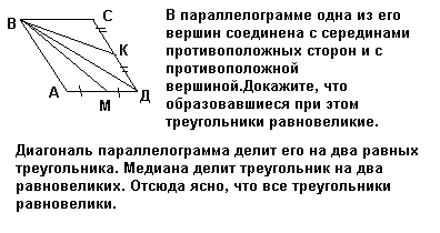 В параллелограмме одна из его вершин соединена с серединами противоположных сторон и с противоположной вершиной.Докажите, что образовавшиеся при этом треугольники равновеликие.
