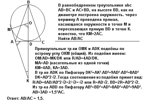 В равнобедренном треугольнике abc АВ=ВС и АС<BD, на высоте BD, как на диаметре построена окружность. через вершину А проведена прямая, касающаяся окружности в точке М и пересекающая прямую BD в точке К. известно, что КМ=2АС. найти АВ/АС