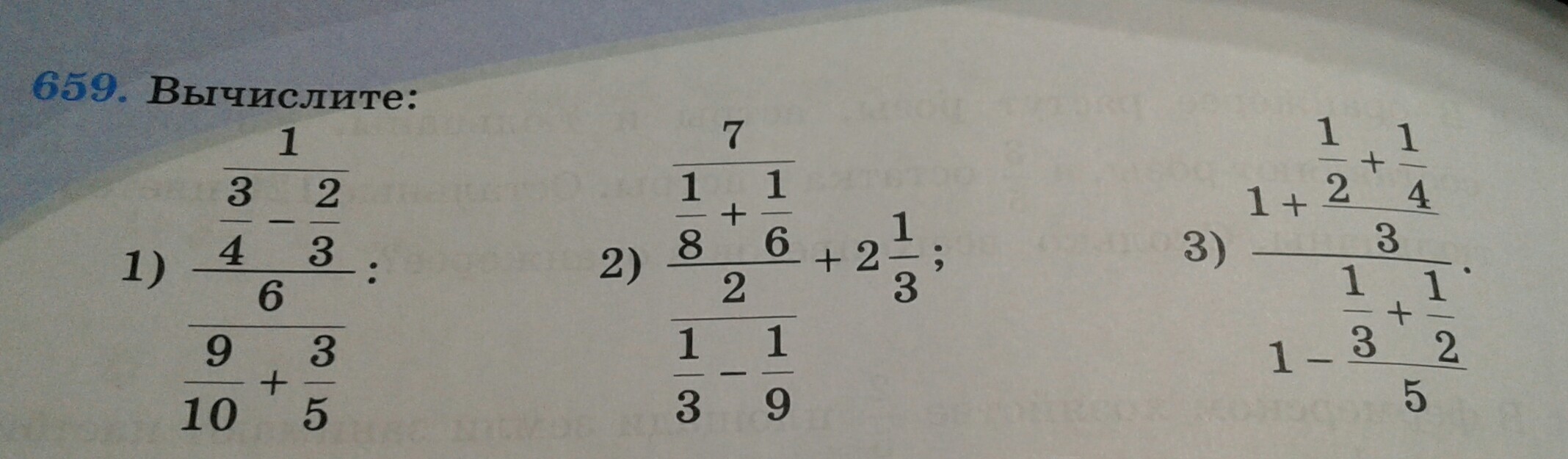 1/(3/4-2/3)/6/(9/10+3/5)=1/(9/12-8/12)/6/(9/10+6/10)=1/(1/12)/6/(15/10)=12/6/(15/10)=2/(15/10)=(2/1)*(10/15)=20/15=1и1/3