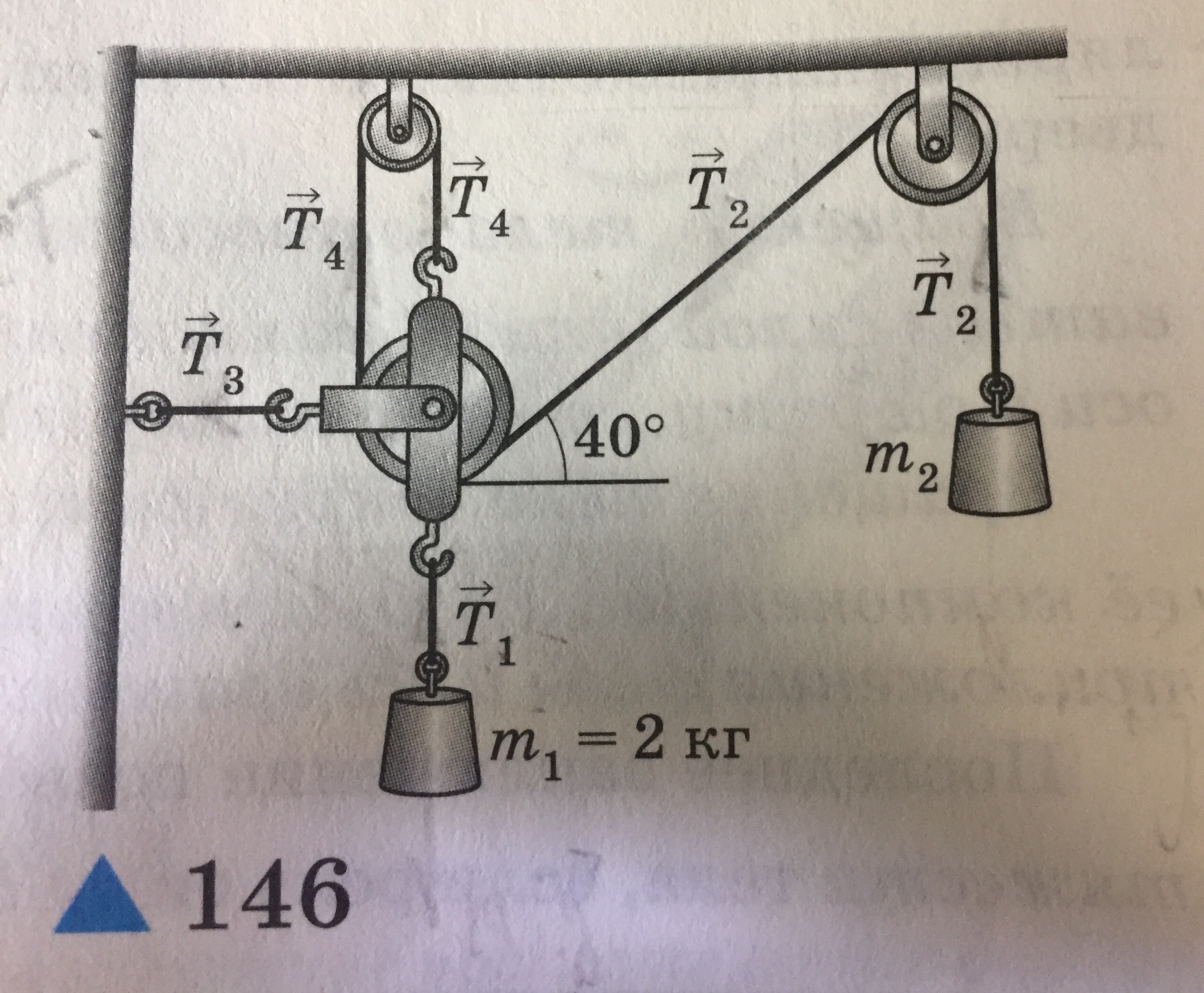 Оси:х вправо,у вверх. Силы: Т1 от блока вниз по нити, Т2 ,Т3,Т4 от блока направляются по соответствующим нитям. На ось х: -Т3+Тcos40°=0. (2). На ось у: -Т1+2•Т+Тsin40°=0. Отсюда Т=Т1/(2+sin40)=19,6/2,642= 7,4 H. Из (2): Т3=Тcos40=5,7 H. Из (1) m2=Т/g=7,4/9,8=0,76 кг