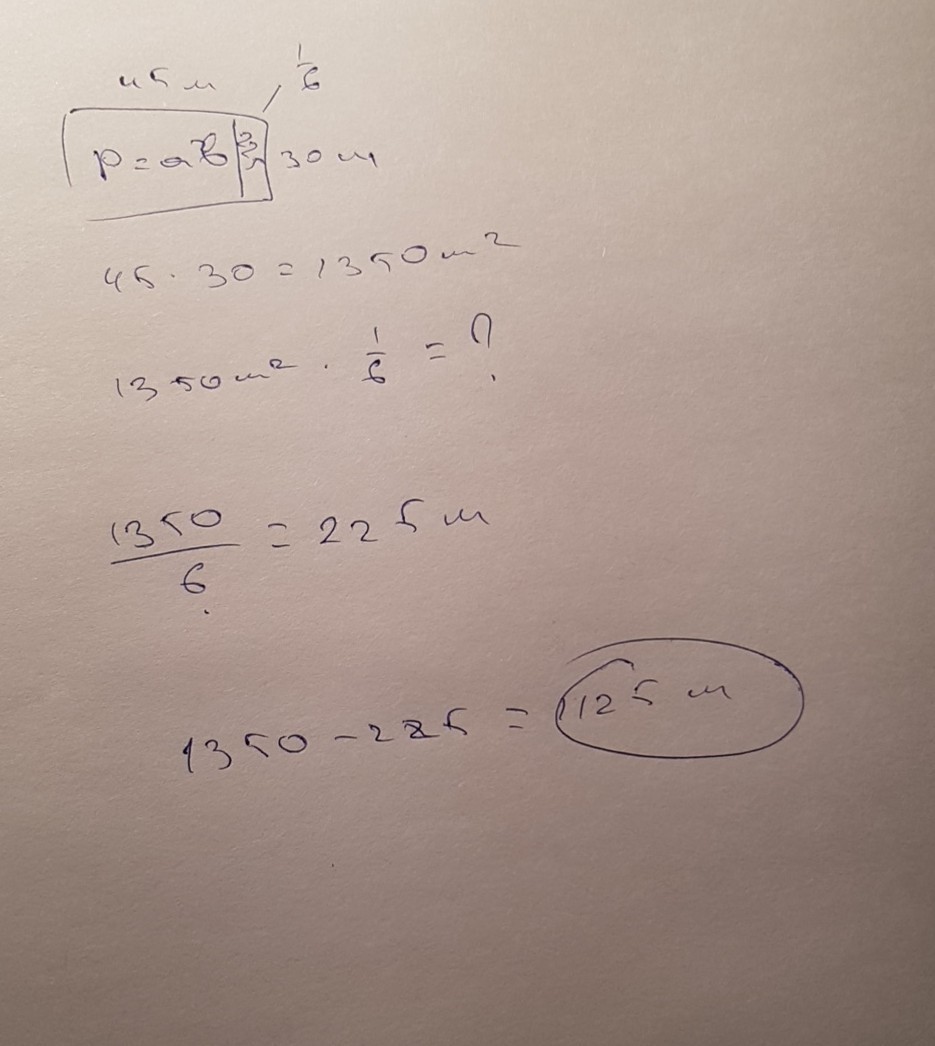 Длина сада прямоугольной формы 45м , а ширина 30м . 1/6 часть сада занята кустарником , а остальная часть сада -плодовыми деревьями . На сколько квадратным метров меньше занято кустарниками , чем деревьями?