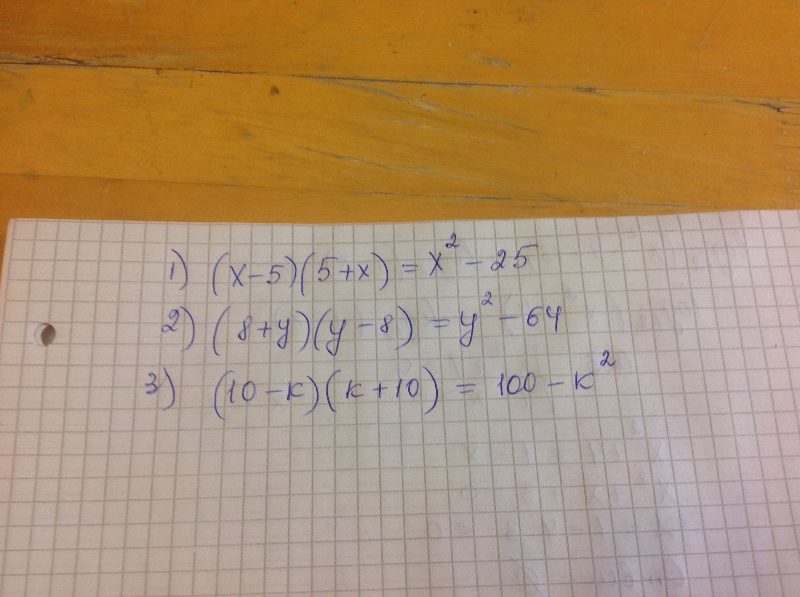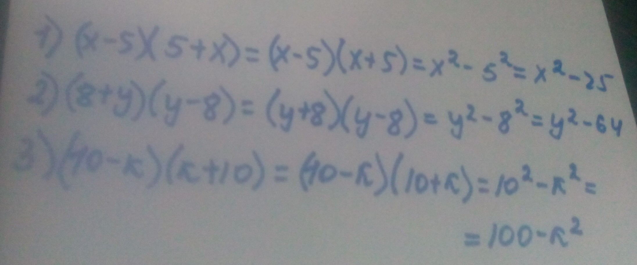 1) (x-5)(5+x) 2) (8+y)(y-8) 3) (10-k)(k+10) выполните действие.