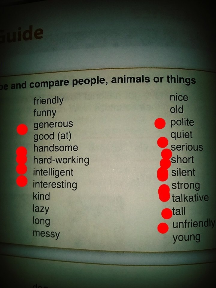 Дженорис, хэндсам, хад-вокин, инчележент, интрэсин, полайт, сириос, шот, сайлант, строн, токэтив, толл, анфрэндли.