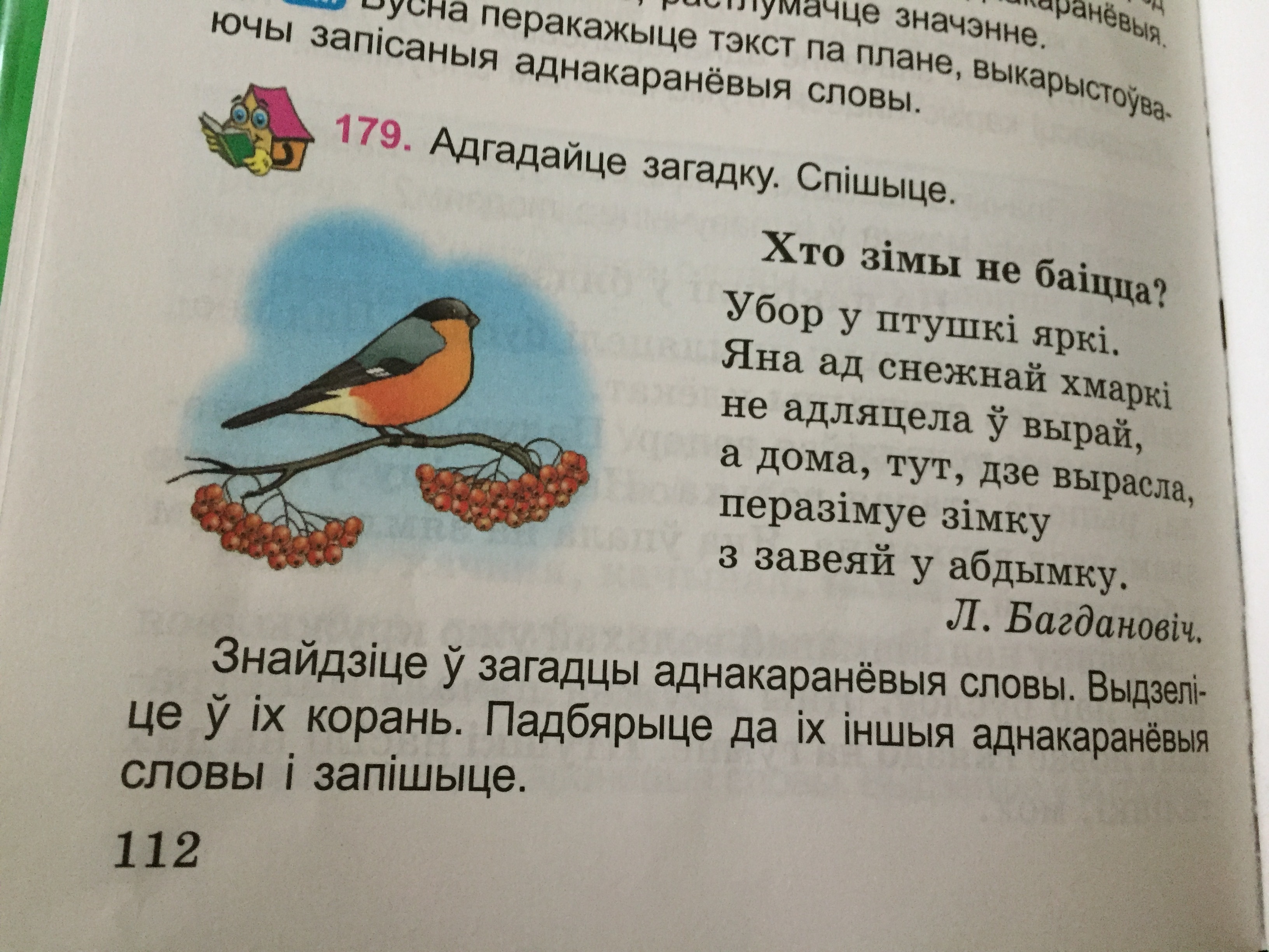 Адгадка: снягір/гіль. Аднакаранёвыя словы: пера-зім-уе, зім-ку. Калі яшчэ можна дадаць свае словы ў гэты спіс: зім-аванне, зім-овы