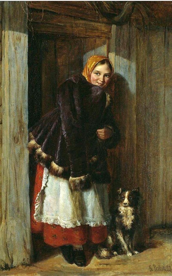 Например, картина «У калитки». Что так развеселило молодую девушку в шубке и её четвероногого друга? Может быть, они смотрят на праздничный хоровод или ряженых? Такие картины Рачкова – как будто маленькие рассказы, где зритель может сам представить себе тогдашнюю жизнь и увидеть красивых, весёлых людей, какими видел их сам художник.