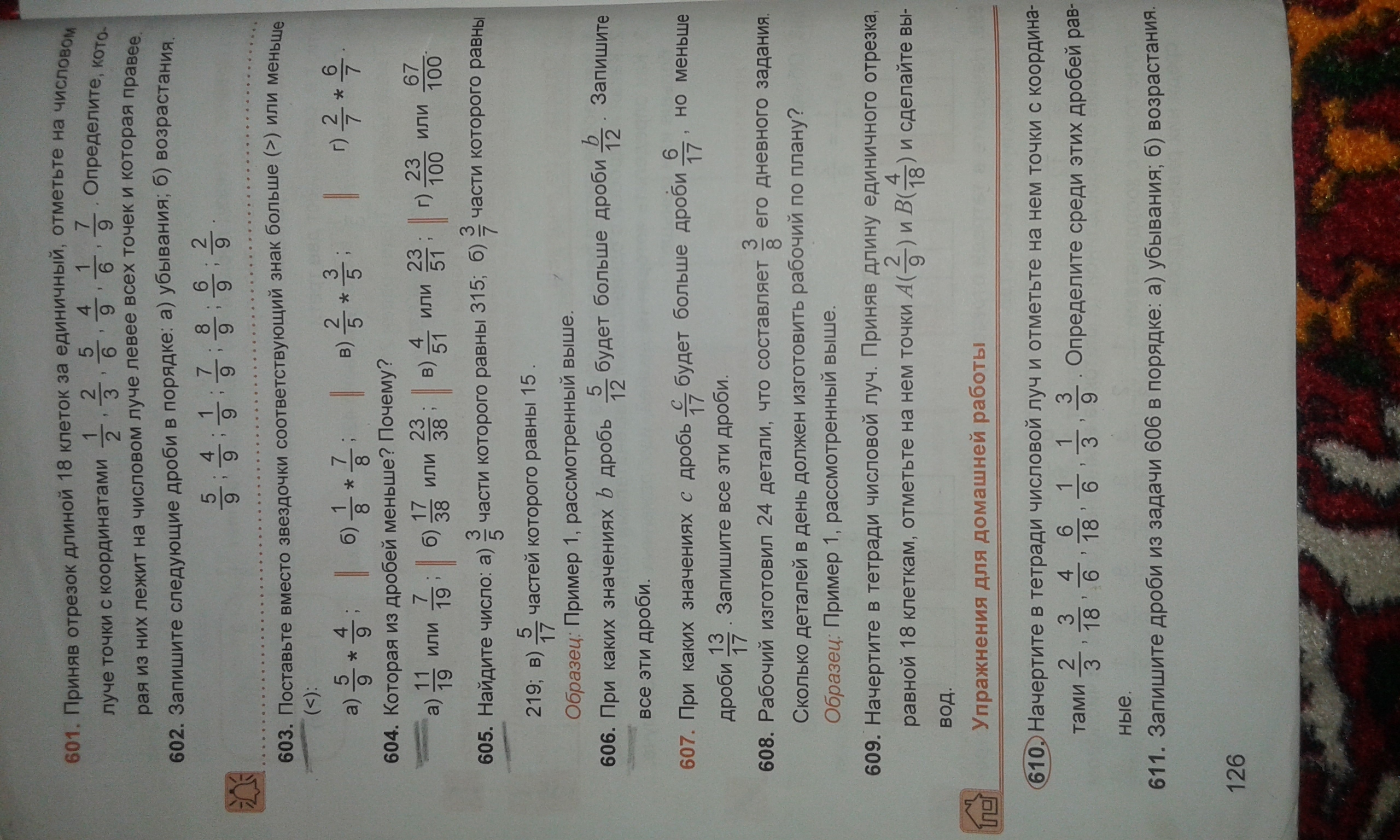 В 610 нужно привести все дроби к одному знаменателю - 18 , начертить луч из 18 клеток и отметить на нем точки по значению в числителе. Например: 2/3 - это 12/18 , считаешь 12 клеточек на луче и ставишь там точку