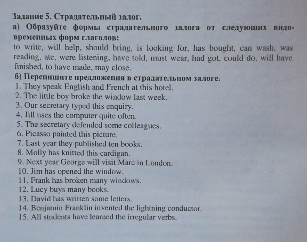 is written, will be helped, should be brought, is being looked for, has been bought, can be washed, was being read, was eaten, were being listened, have been told, must be worn, had been got, could be done, will have been finished, have been made, may be closed