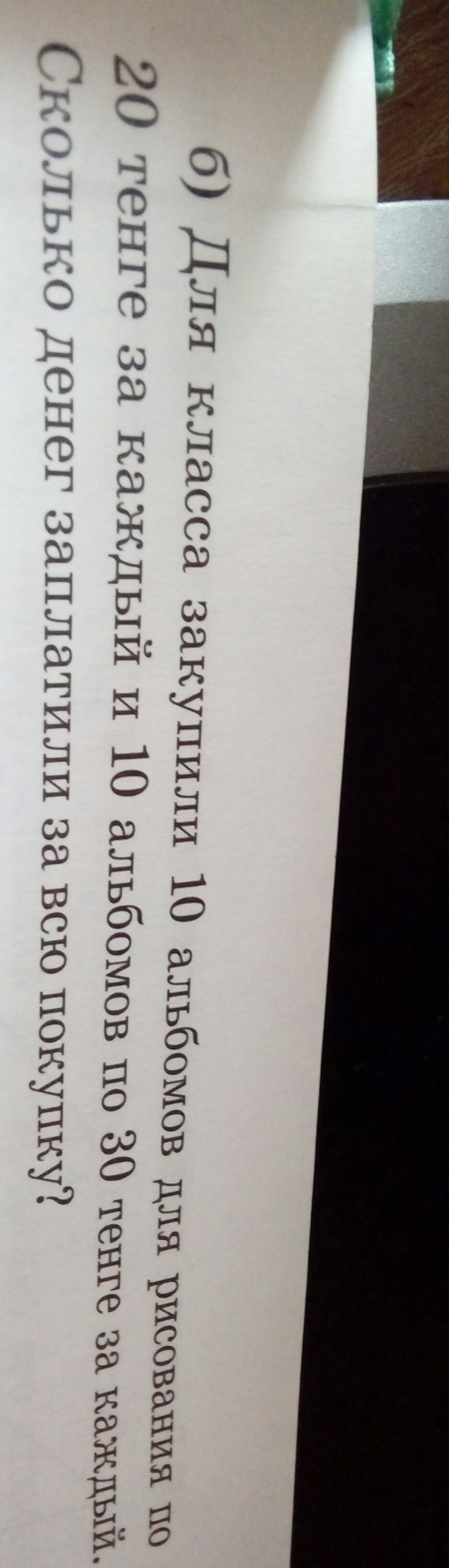 для класса купили 10 альбомов для рисования по 20 тенге за каждый и 10 альбомов по 30 тенге за каждый Сколько денег заплатили за всю покупку?