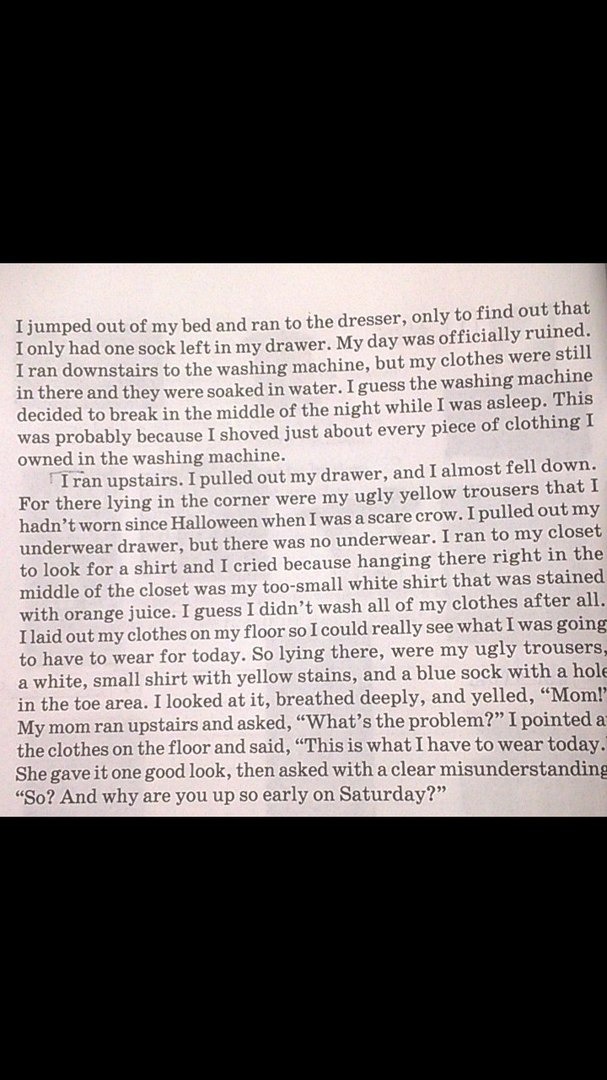 21:42 Я выскочил со своей кровати и побежал к комоду, только чтобы узнать, что в ящике остался один носок. Мой день был официально разрушен. Я побежал вниз к стиральной машине, но моя одежда все еще была там, и они были пропитаны водой. Думаю, стиральная машина решила сломаться посреди ночи, пока я спал. Это было, вероятно, потому, что я сунул почти все предметы одежды, которыми я владел в стиральной машине. Я побежал наверх. Я вытащил свой ящик, и я чуть не упал. В углу лежали мои уродливые желтые брюки, которые я не носил с Хэллоуина, когда была пугающая ворона. Вытащил мой ящик для нижнего белья, но не было нижнего белья. Я побежала к своему шкафу, чтобы найти рубашку, и я заплакала, потому что вися там прямо посреди шкафа была моя слишком маленькая белая рубашка, окрашенная апельсиновым соком. Наверное, я все-таки не вымыл всю свою одежду. Я выложил свою одежду на свой пол, чтобы я мог действительно понять, что у меня будет сегодня. Так лежали, были мои уродливые брюки, на которых можно было носить, и синий носок с дыркой с пятнами, в области пальца. Я посмотрел на него, глубоко вздохнул и заорал: «Мама! Моя мама побежала наверх и спросила:« В чем проблема? »Я указал на одежду на полу и сказал:« Это то, что я должен носить сегодня. Она дала ему одно замечание, затем спросила с ясным недоразумением: «Итак, почему ты так рано в субботу?» OTBET