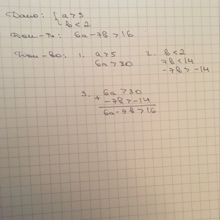 Известно, что а больше 5 и b меньше 2. Докажите, что 6а-7b больше 16.