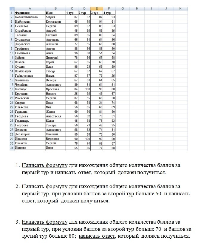 3) =СУММЕСЛИМН(C2:C31;E2:E31;">80";D2:D31;">70")