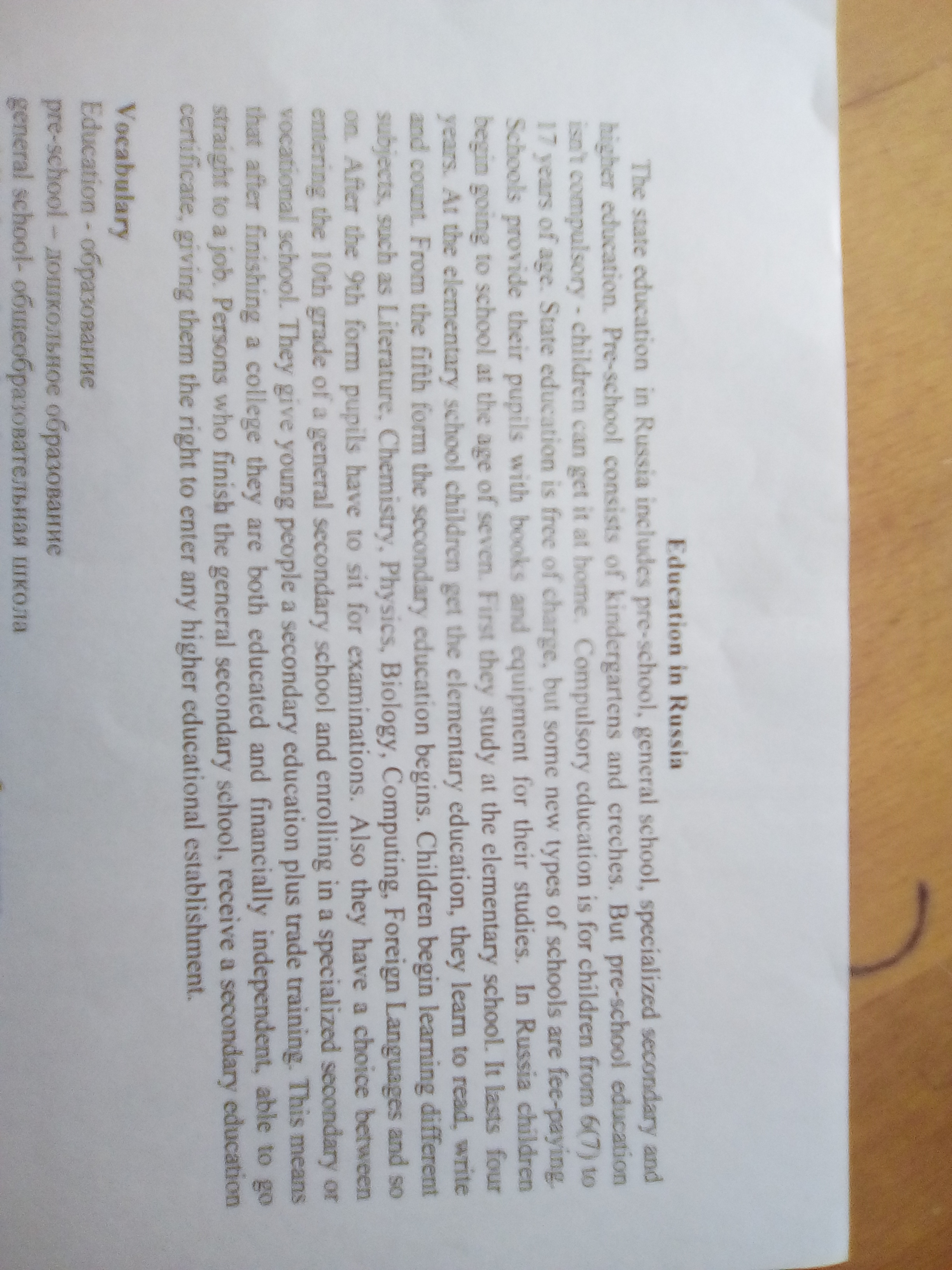 Государственное образование в России включает в себя дошкольное, основную школу, специальное среднее и высшее образование. Дошкольное состоит из детских садов и яслей. Но дошкольное образование не обязательно - дети могут получить его дома. Обязательное образование это образование для детей от 6(7) до 17лет. Государственное образование бесплатно, но некоторые типы школ берут плату. Школы снабжают учеников учебниками и оборудованием для учебы. В России дети начинают ходить в школу в 7 лет. Сначала они учатся в начальной школе. Это длится 4 года. В начальной школе дети получают начальное образование. Они учатся читать, писать, считать. С 5-го класса начинается среднее образование. Дети начинают учить разные предметы такие как литература, химия, физика, биология, информатика, иностранные языки и т.д.. После 9-го класса ученики должны сдать экзамен. Также у них есть выбор: идти в 10 класс или уйти в колледж. Они дают людям среднее образование и тренировку в торговле. Это значит, что после окончания колледжа они становятся финансово независимы, и могут пойти работать. Те кто закончил общее среднее образование получают диплом, дающий им право поступить в университет