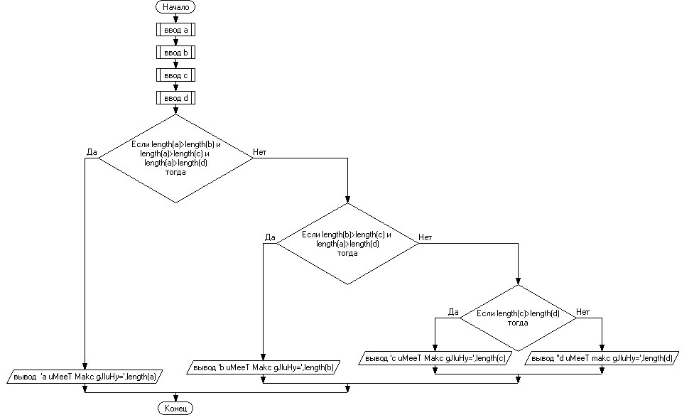 Program naconecto;vara,b,c,d:string;BEGINwriteln('a=');writeln('b=');writeln('c=');writeln('d=');readln(a);readln(b);readln(c);readln(d);if (length(a)>length(b)) and (length(a)>length(c)) and (length(a)>length(d)) then begin writeln('a uMeeT Makc gJluHy=',length(a)); endelse if (length(b)>length(c)) and (length(a)>length(d)) then begin writeln('b uMeeT Makc gJluHy=',length(b)); endelse if (length(c)>length(d)) then begin writeln('c uMeeT Makc gJluHy=',length(c)); endelse begin writeln('d uMeeT makc gJluHy=',length(d)); end;readln;END.