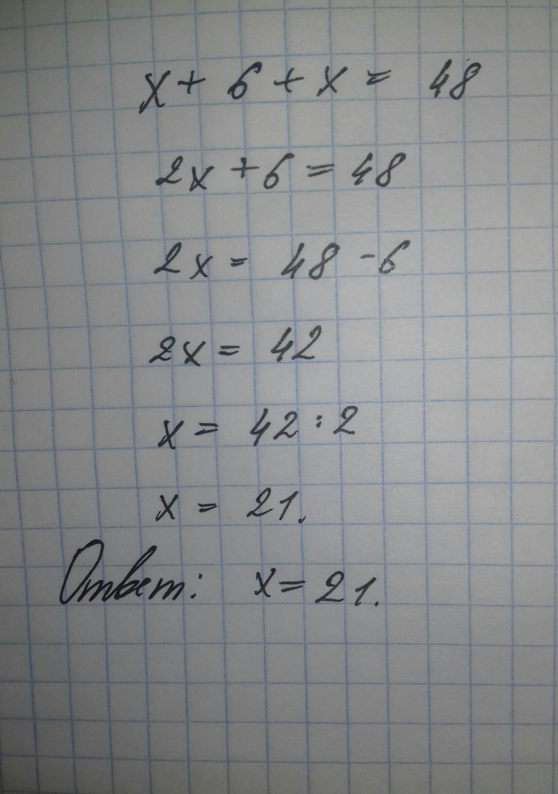 x+6+x= 48 решите пожалуйста!!!