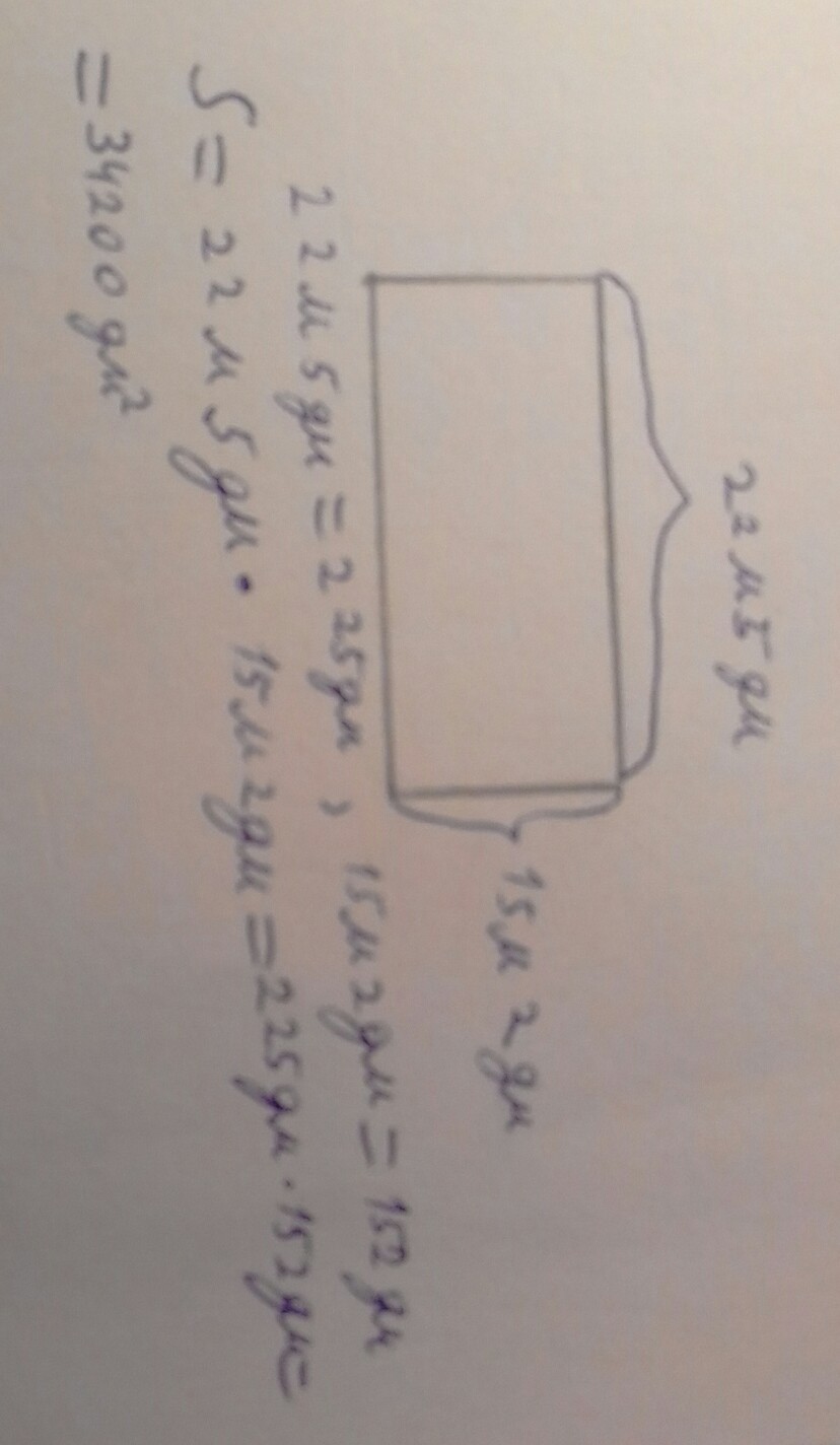 Ширина прямоугольника участка земли 15м 2дм, а длина 22м 5дм. Вычислите площадь участка и выразите её в квадратных метрах. НАРИСУЙТЕ ПЛИЗ!!!!