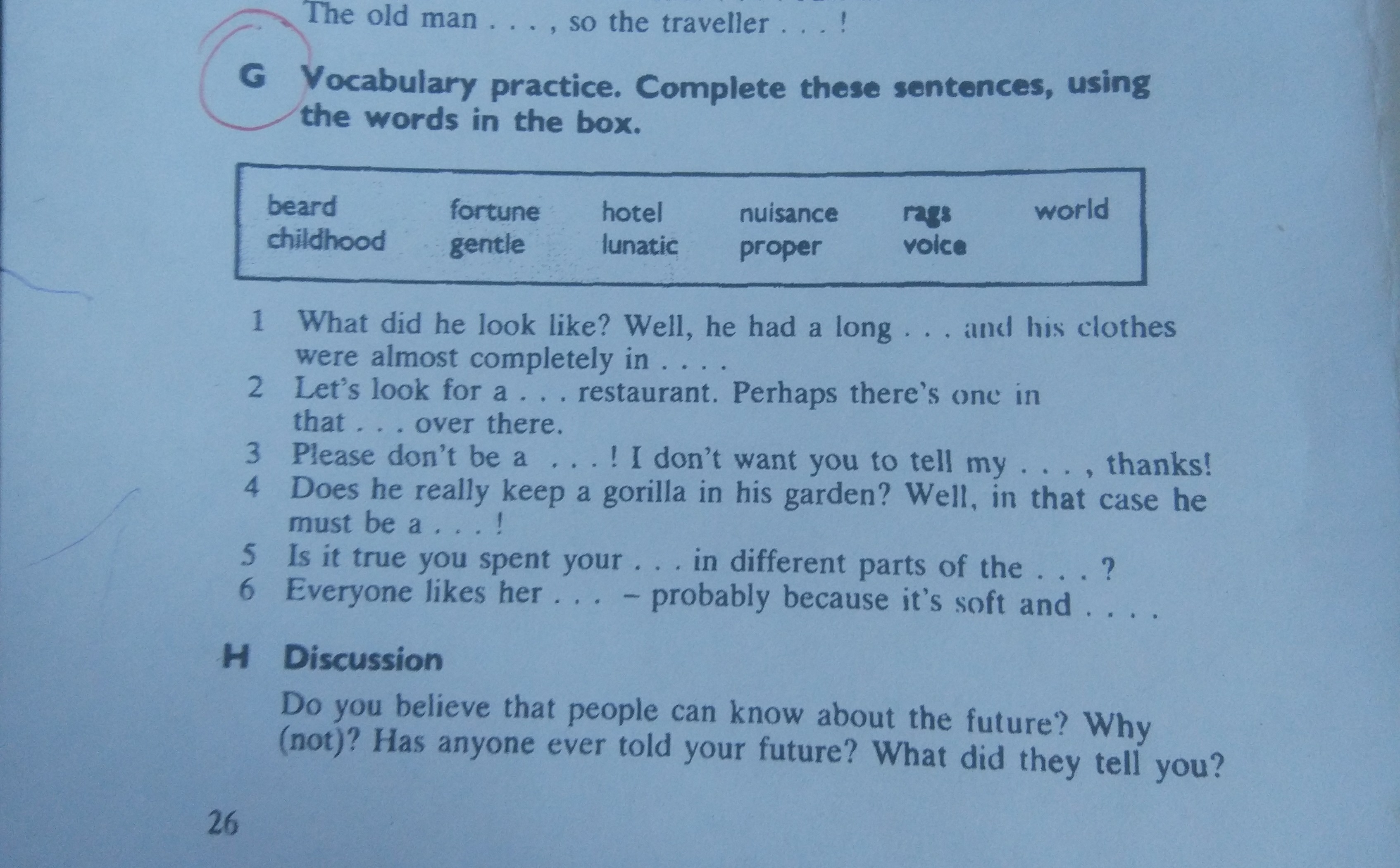 1. beard, rags, 2. proper, hotel, 3. nuisance, fortune, 4. lunatic, 5. childhood, world, 6. voice, gentle