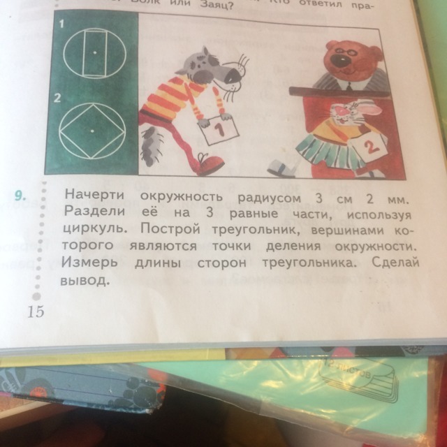 начерти окружность радиусом 3см 2мм.Раздели ее на 3 разные части, ( номер 9) начертите плиииз на бумажке, а то я не могу сыну обьяснить как сделать , забыла уже