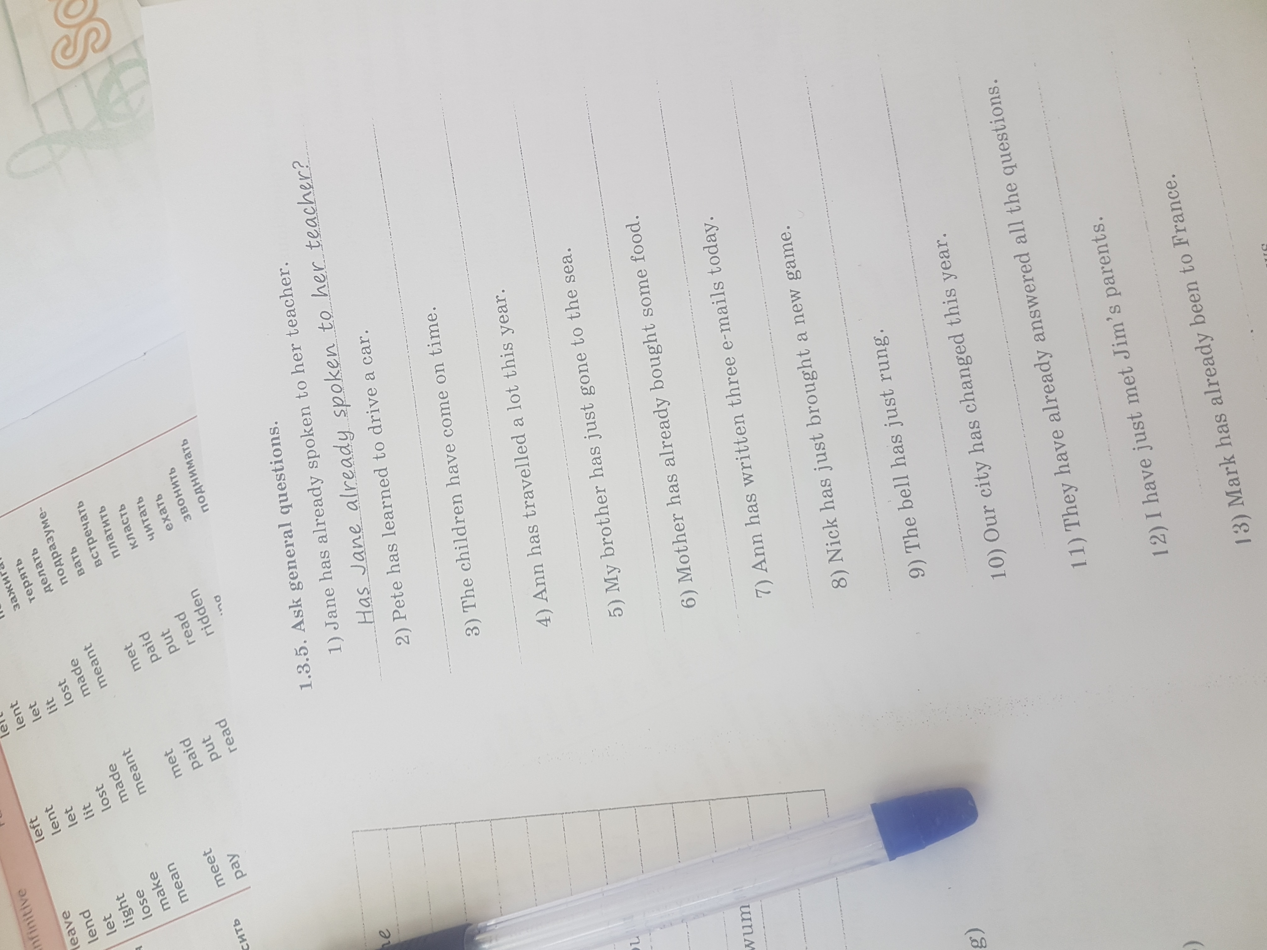7) Has Ann writen three-emails today? 8) Has Nick just brought a new game? 9) Has the bell just rung? 10) Has our city changed this year? 11) Have they already answered all the questions? 12)Have you just met Jims's parents? 13) Has Mark already been to France?